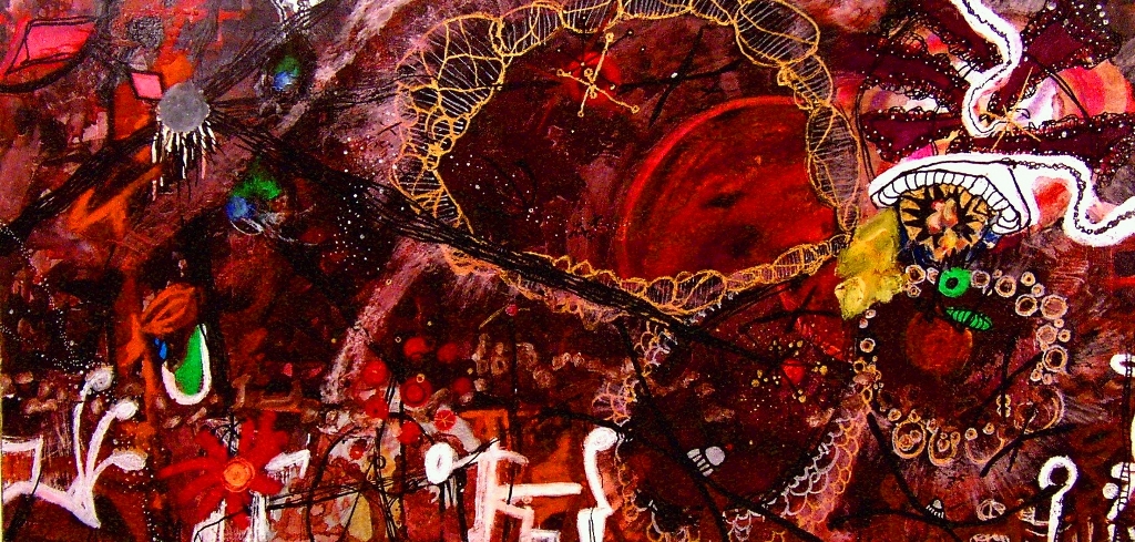 The works I create usually harken back to my creation myth in some respect, and I hope that the stories I tell in my paintings communicate a basic narrative to my viewers. However in truth these stories I tell myself serve as usually means to lay down colors patterns marks and collage in a specific order and usually on paper mounted to board. They’re my motifs, with often subliminal meaning for me.