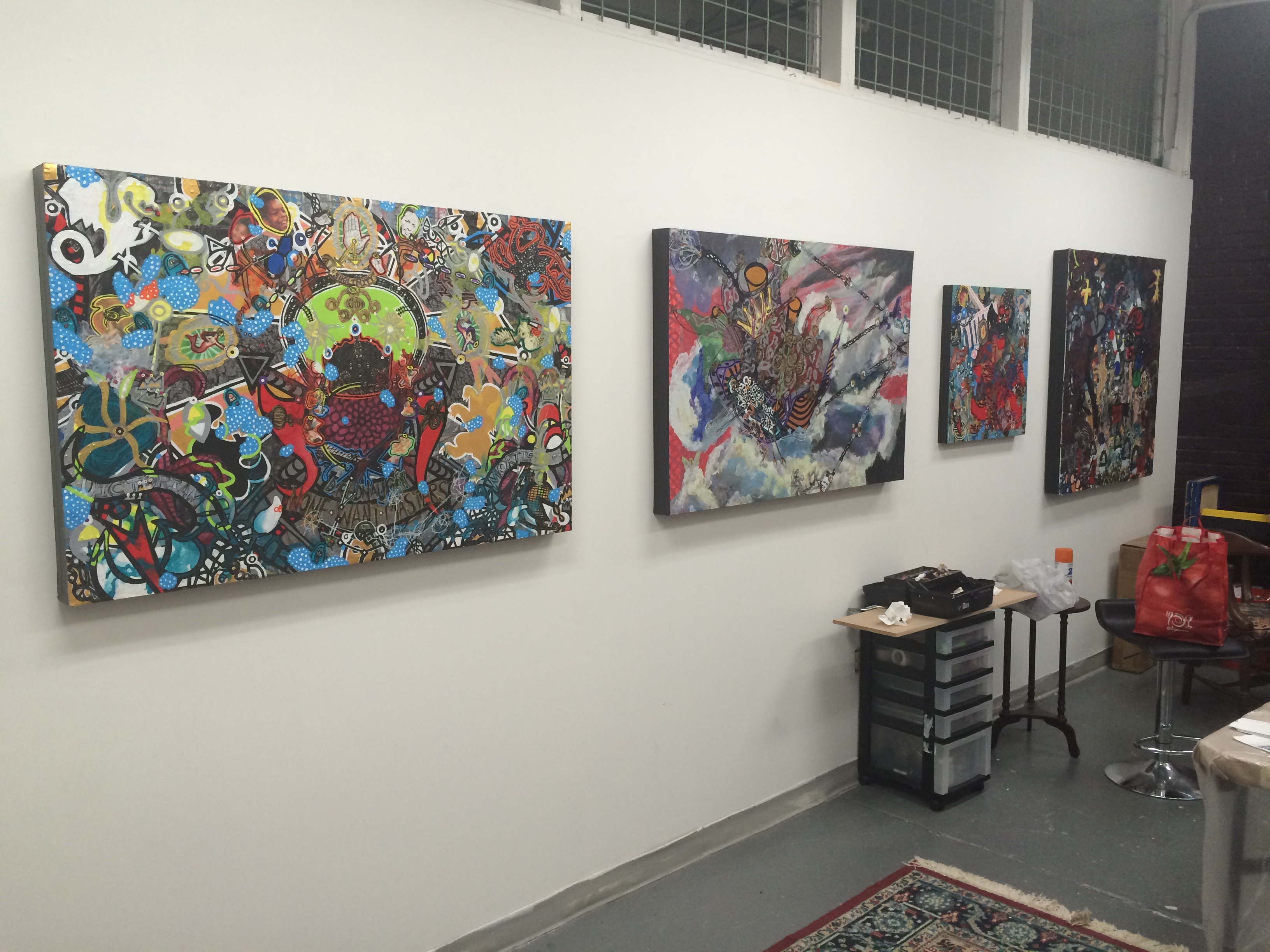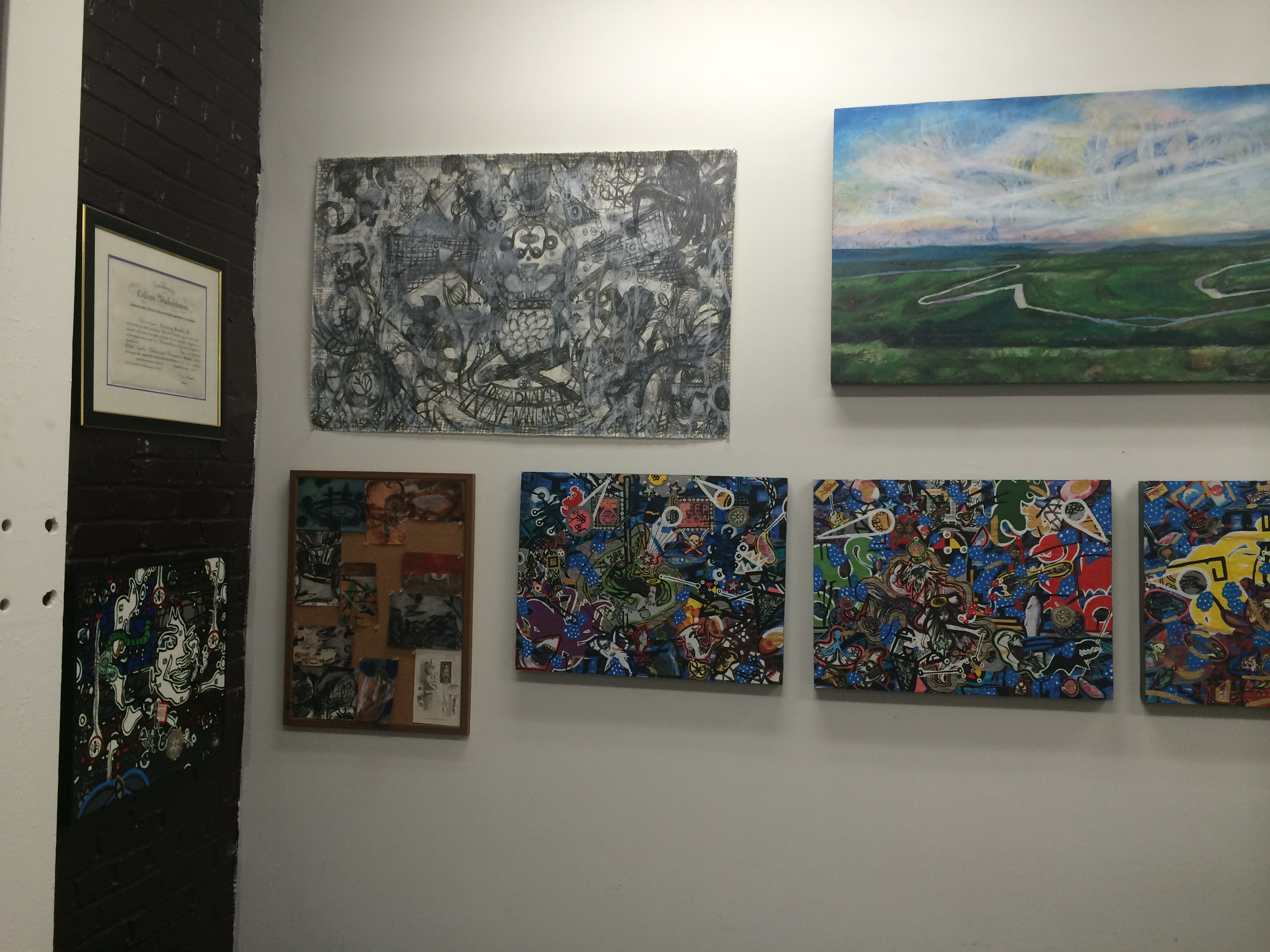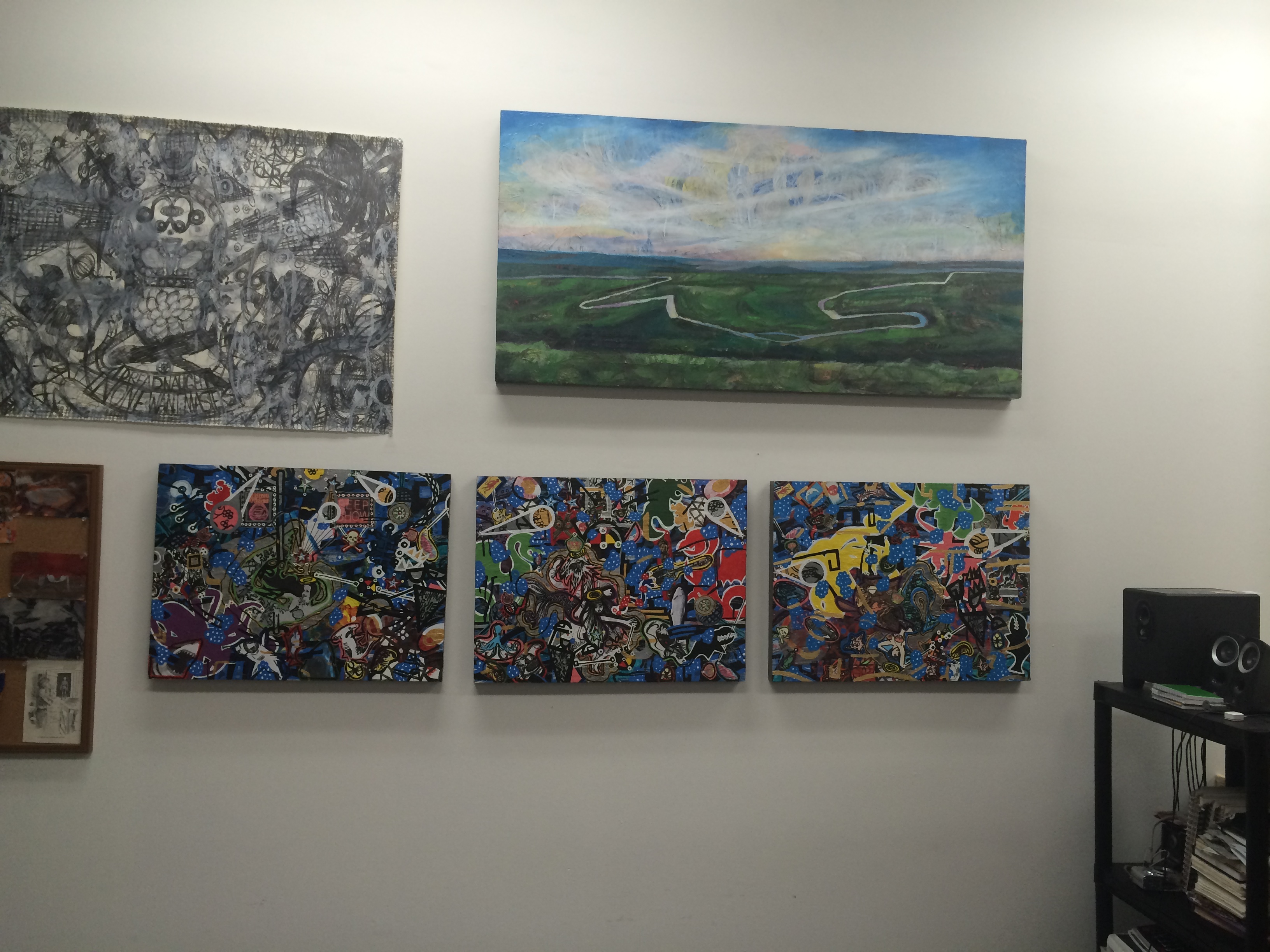 During both FF’s folks responded to the color in my works and it seemed they responded well to the aggressive mark-making of some of my drawings, both encouraging responses. I also got some leads that will I hope lead to some new shows. Its been a few days since the last FF so I’ll try in the future to blog closer to FF to give more details. What follows here is the studio set up for both First Fridays. I’ll try to change it up for each open studio.