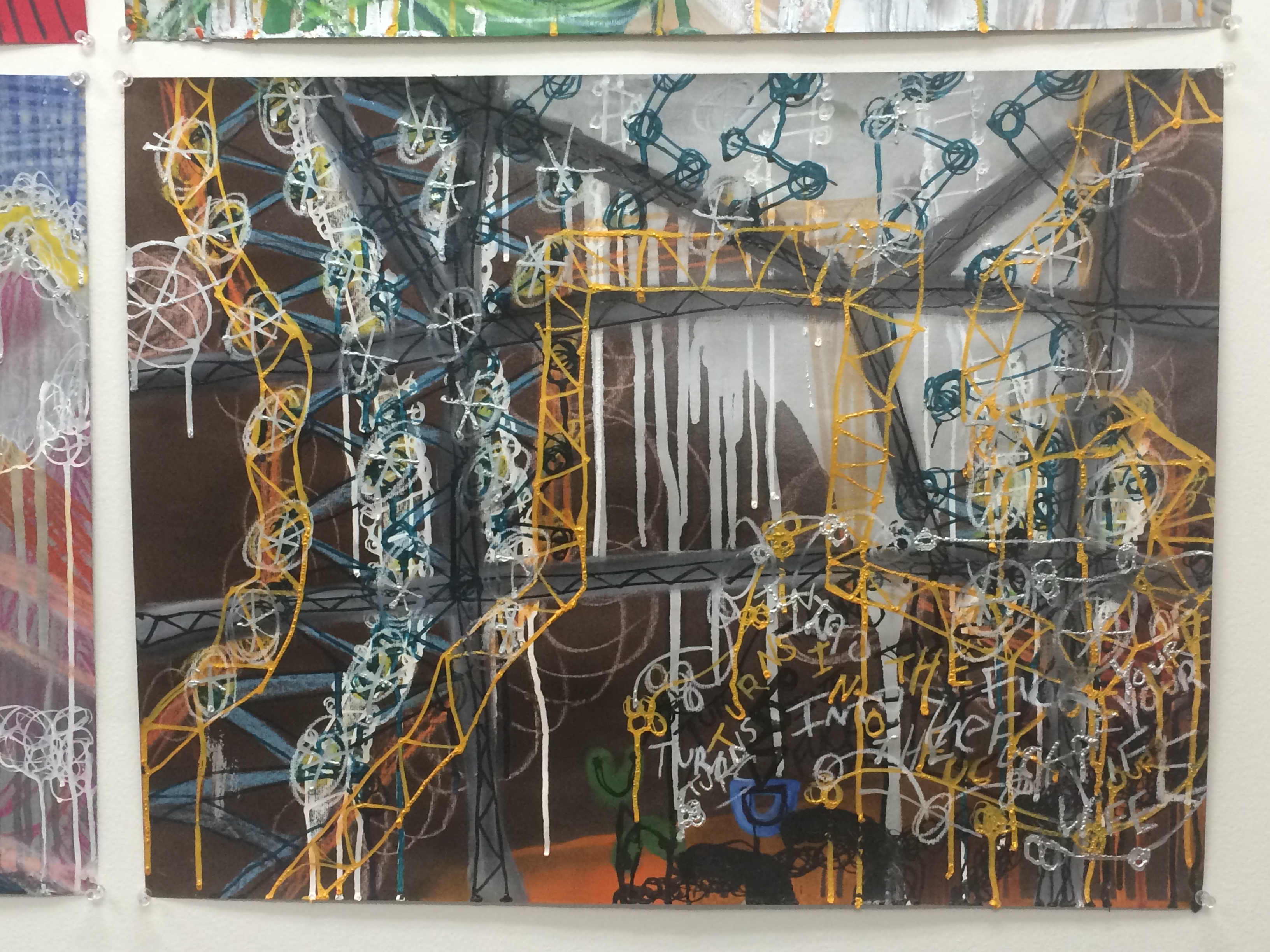 Just finished up a new set of drawings called “Puppet Pal Friends French Kiss and Go Down”. As a series it was supposed to be an exploration of how relationships change over time, and also an excuse to play with spray paint and dripping acrylic ink. There were times, especially near the middle end of the series, when working on these pieces felt truly blissful. There is a point in my works when all the materials and colors begin to “rotate” and I know that the piece is working. The beginning work in the set sucks in my mind but I expected that to happen. I love painting in serial form just for that reason. I like to leave room for a disaster to occur so I can learn and grow from the experience.