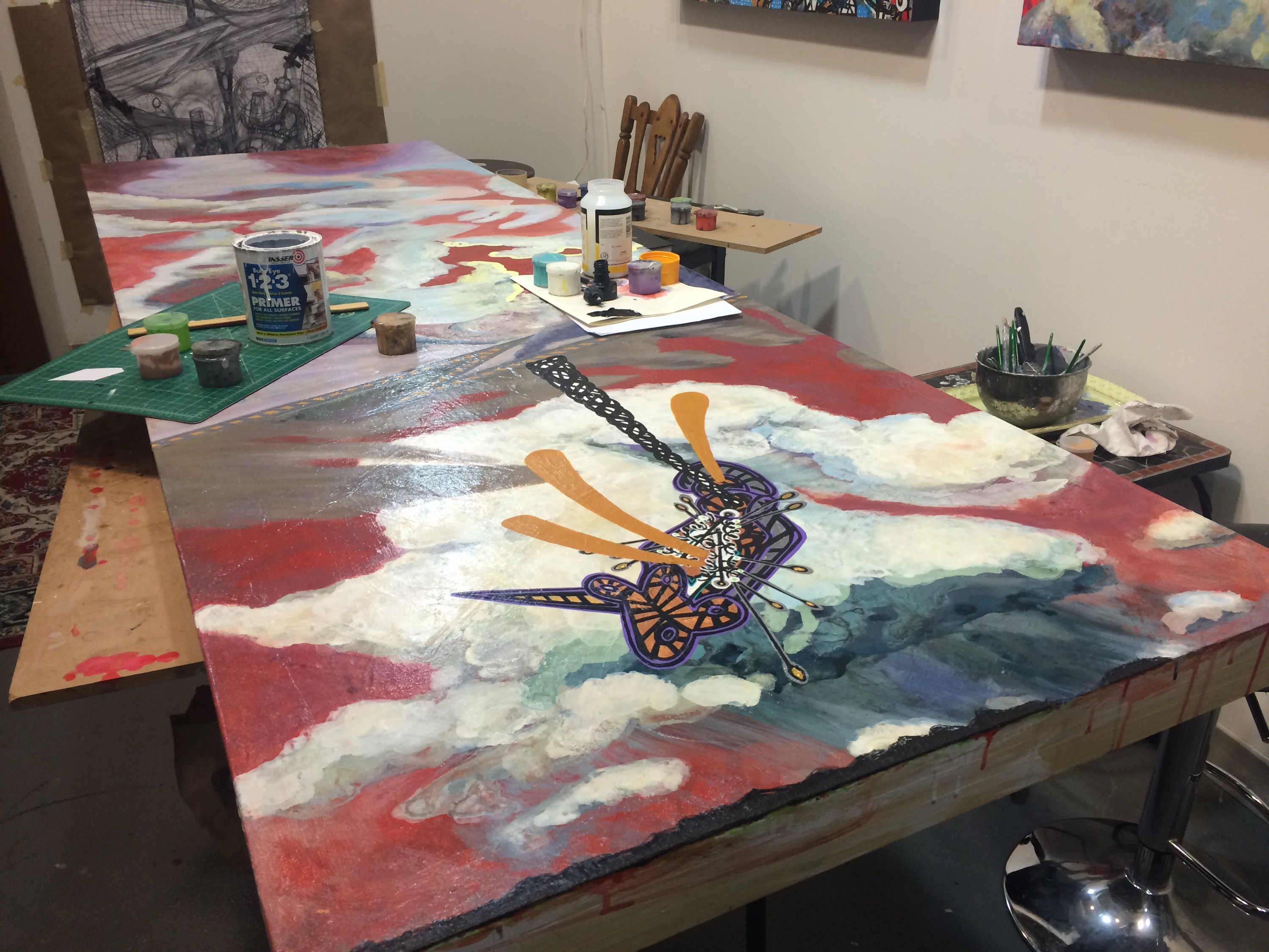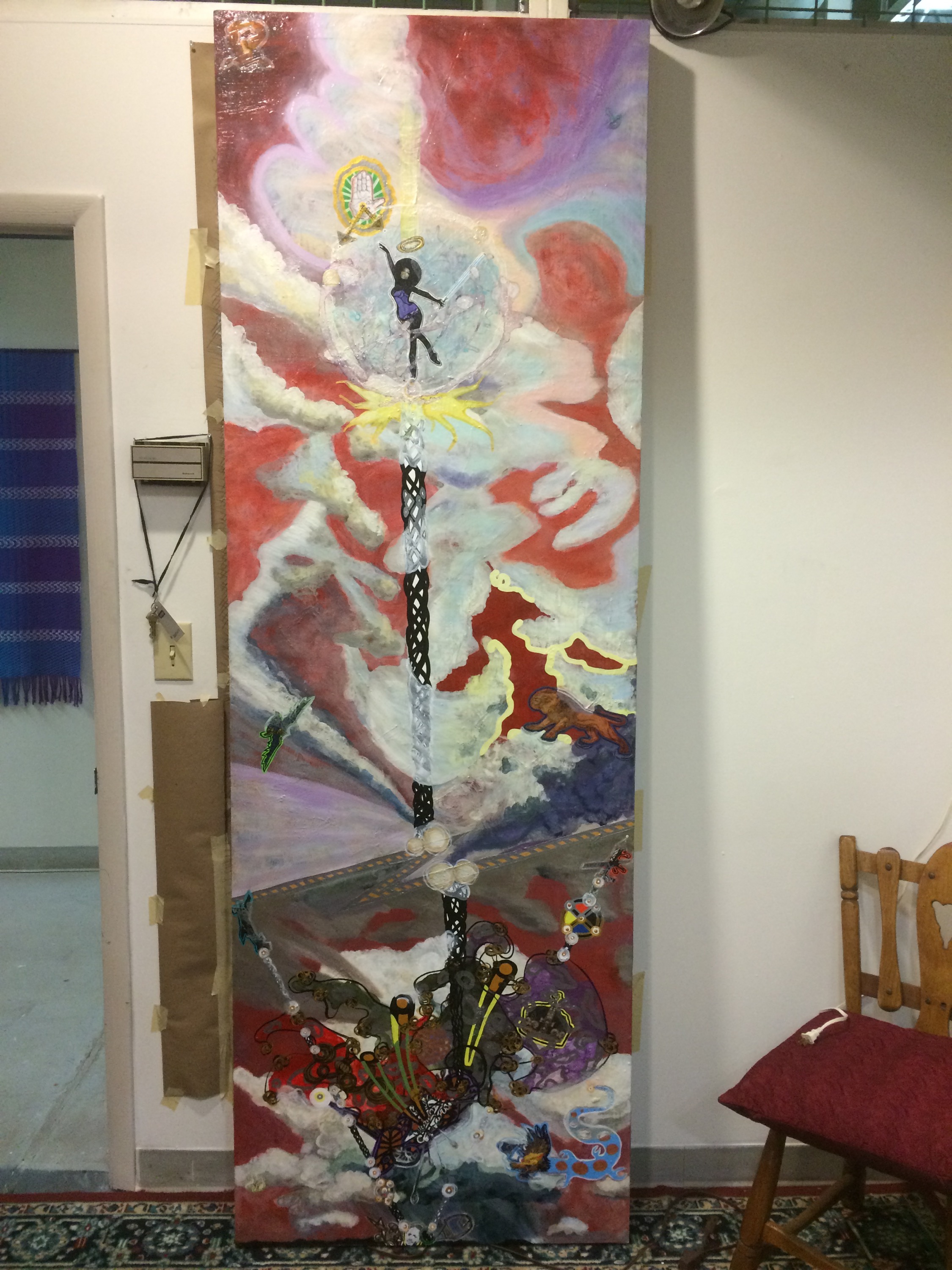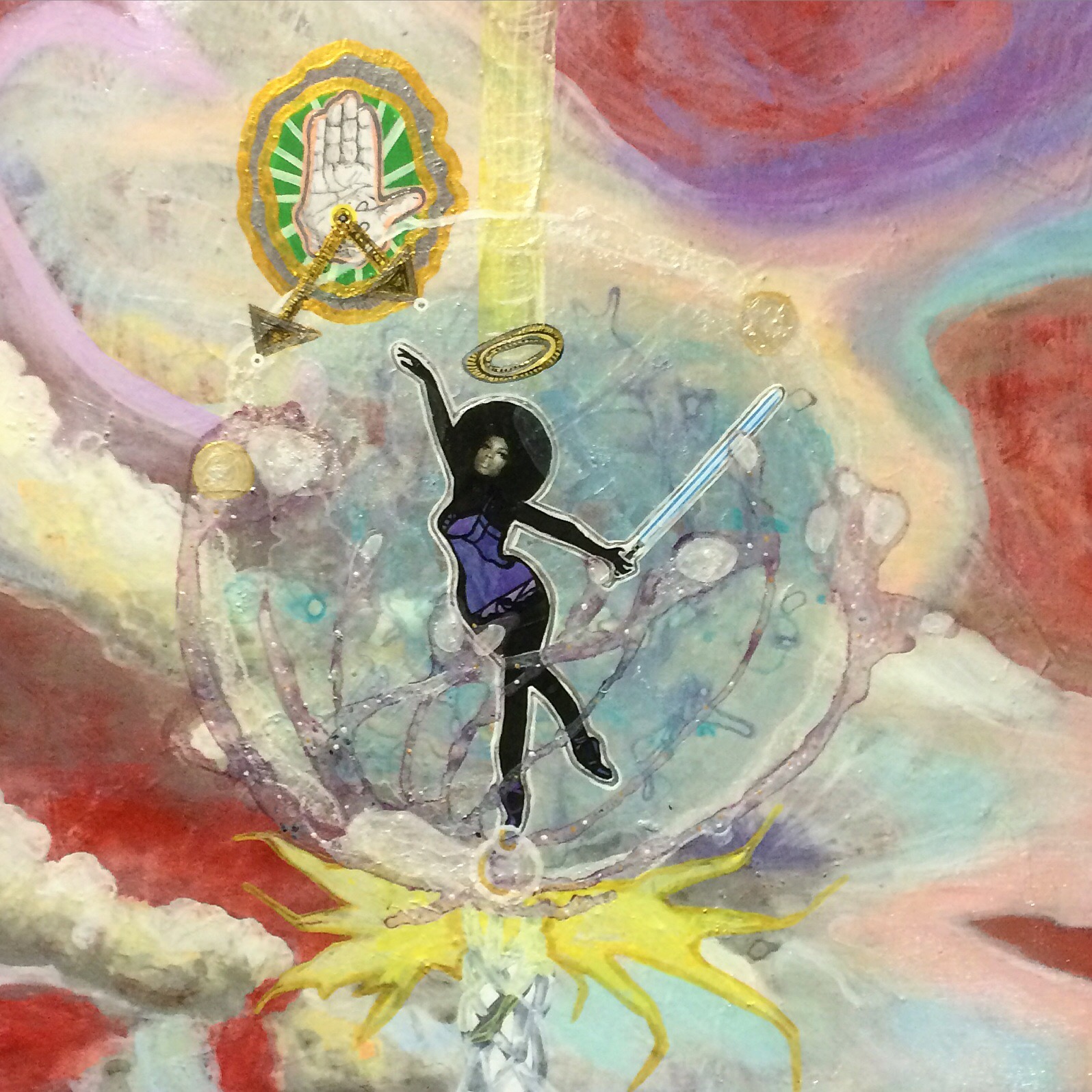I spoke a lot about fear while making this work. That fear stayed with me right until the end. I’ve been dreaming of this work for at least 5 years. I always thought it would be too big and unwieldy to do. I only decided to attempt it when I got my studio in February as I think I mentioned before. It’s so satisfying to finish and have a dream come true with something that very close to what I imagined. Ok without further ado here’s “Pilot #4” complete along with a close up of my Diana Ross-lightsaber-wielding-fairy-pilot. Enjoy!