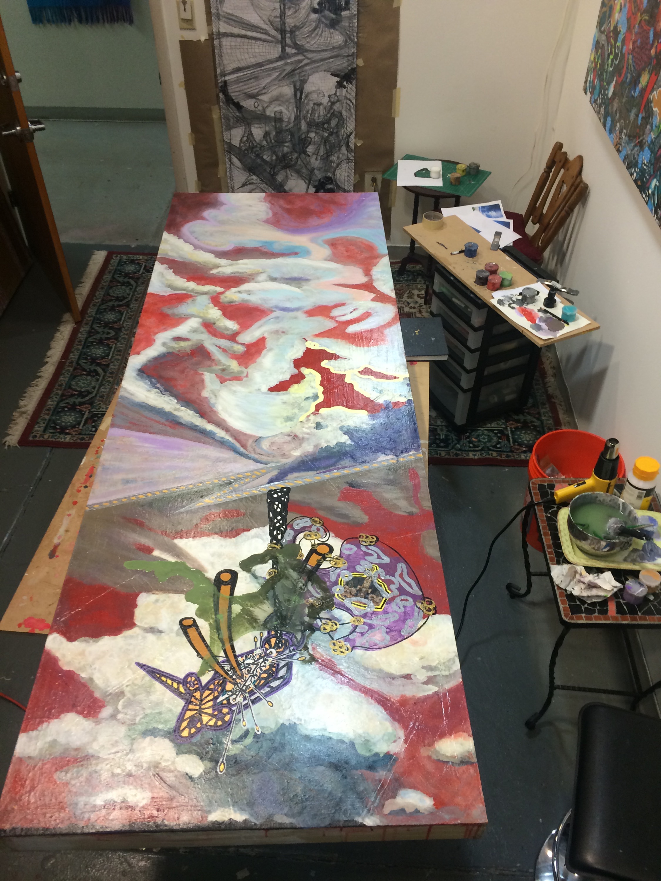 I finally finished “Pilot #4” yesterday and goddam its good. Now the challenge is taking good pics of it and the drawing that came before it. Working in unusual dimensions comes with its drawbacks. It was great to come back from a nice long weekend in Rehoboth Beach, Delaware last week to finish this painting. I had 4 blissful and hard days in a row devoted to painting, which is unusual for me as my job or other commitments usually get in the way of long concentrated art time for me. Starting and stopping a project kills creativity, I’m sure many artist would agree. Here’s what the painting looked like last Wednesday.