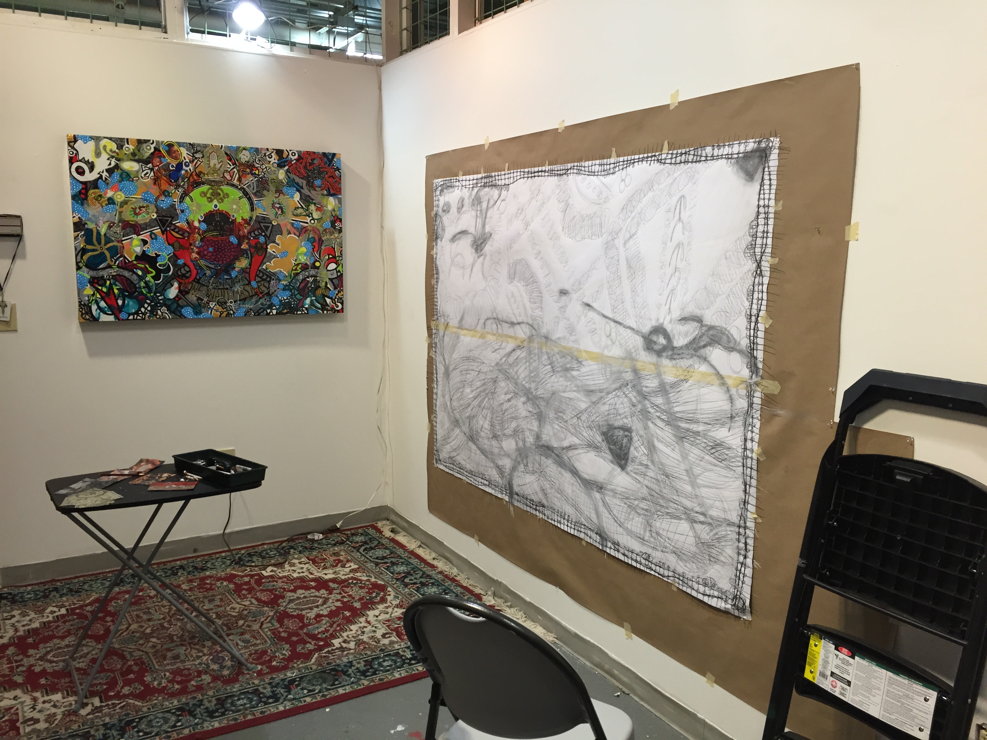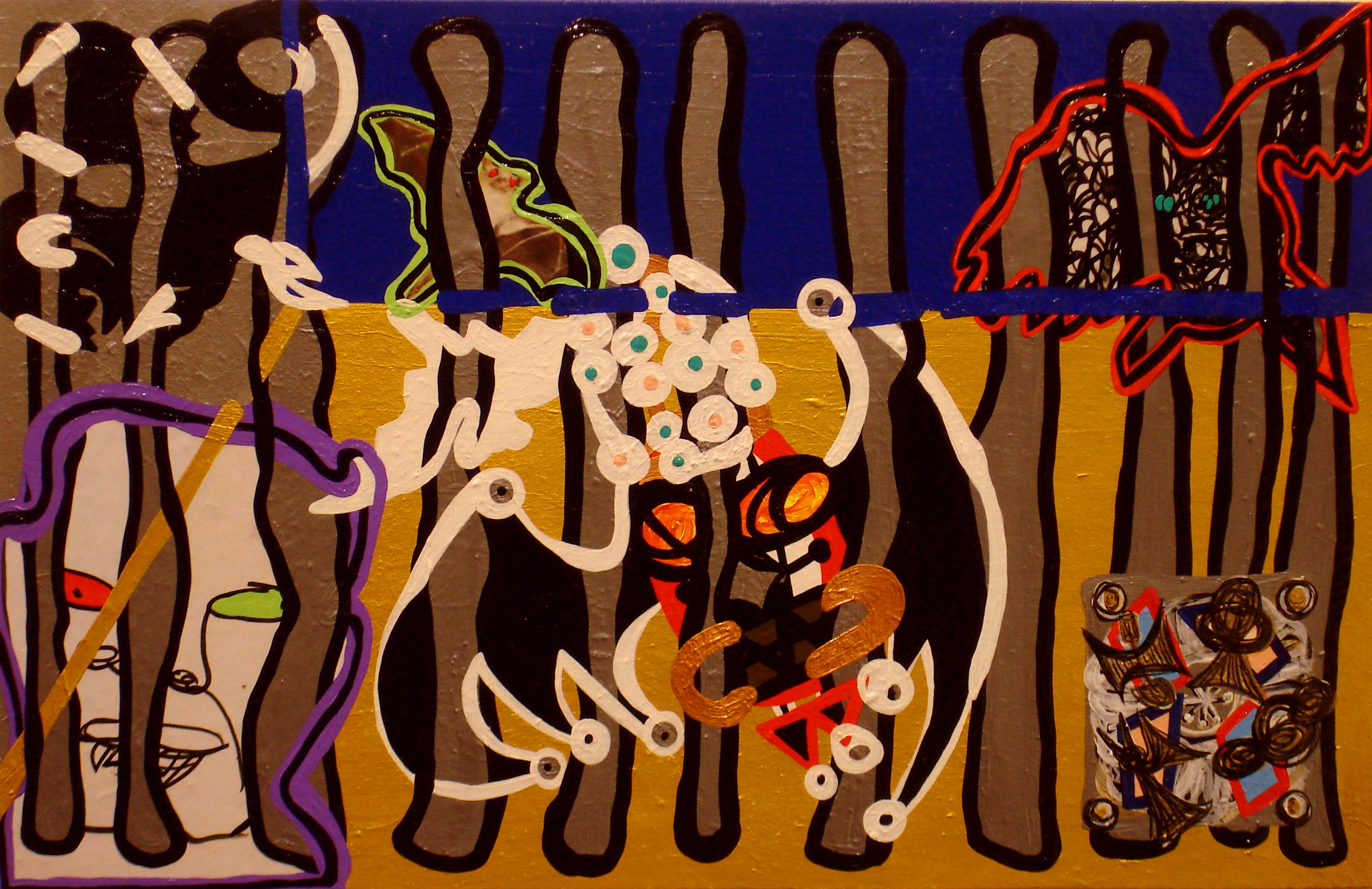 I recently finished a small 4 part series called “Patrick Menagerie” based in part on these cute doodles made by my best friends kid, Patrick Smarr. I consider it a break- set from doing large exhausting works. This pattern of going from a large to a small work is something that seems to have emerged from being in this studio, so I think of it as a natural healthy development. (See below Patrick’s Menagerie 1 -4)