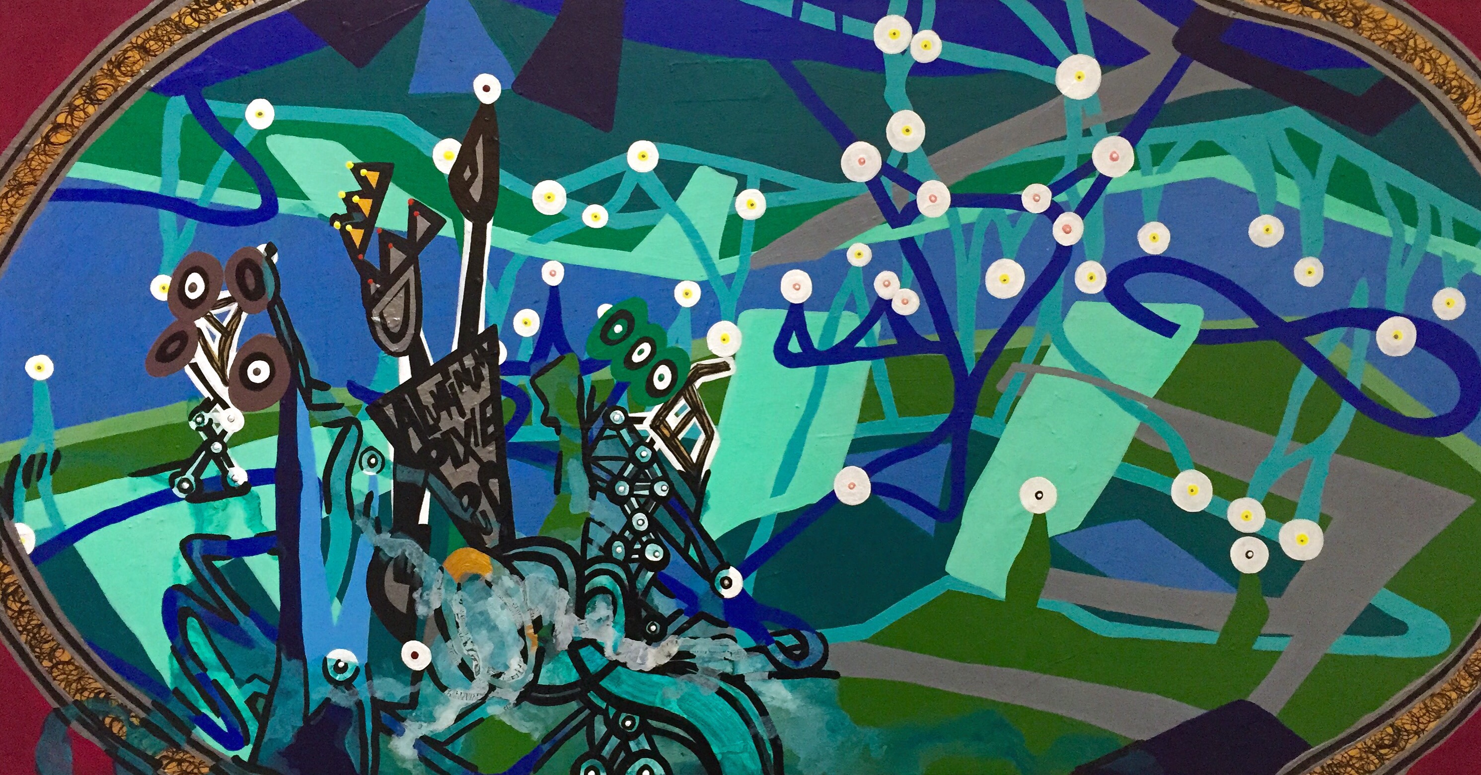 Today I just finished the fifth painting of my Maybe Baby series and I think its more a return to form regarding bright colors and cool cave-like shapes and patterns. I managed to enjoy this painting more than I have in previous pieces. My painting pace seems to be slowing down lately. In the past I could have done a six part series in about a month. I’ve been working on the Maybe Baby series since January. I’m hoping that this slow down means that I’m more contemplative now about painting in general. I worry that the slower pace is the result of a reduced ambition to do larger pieces. I’m trying to shake that trepidation since its hardly stopped me in the past. My studio and apartment are full of over-sized works that I simply felt a compulsion to make. I wonder if getting older and becoming more cautious in general is making me more risk averse. I’m so much more aware of my move artistically. I wonder whether this move or that more is the right one to make for my artistic career, I mentioned these fears before in previous post. I believe going on my residency at the Vermont Studio Center will offer me an opportunity to think more about how I practice my craft, and offer some possible means to break out of this phase of my career. Here’s Maybe Baby #5:
