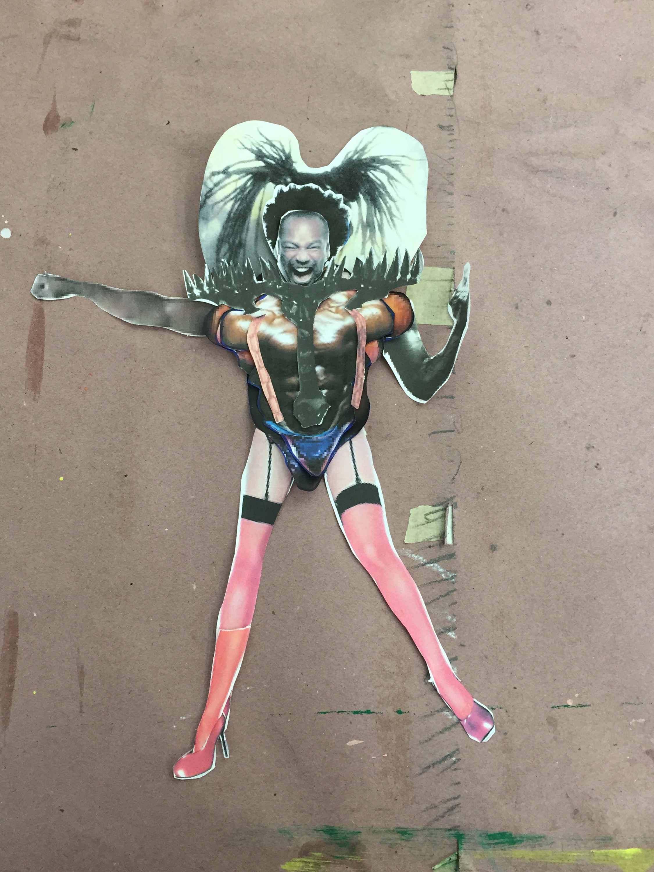 This collage in particular is part of a series of painting that I’ve started here called “The Hotness in Concert”. It’s meant to be the first in a series of paintings featuring this imaginary band in my head I called The Hotness – a band lead by a butch bodybuilder drag-queen in hot red stilettos. I’ve been wanting to do something on this subject matter since I moved into the Banana Factory but being a one-piece-at-a-time artist I felt like I had to get the Pilot set off my plate before I could move on. That project I feel is on hold because the final three pieces in the set are very large works and I feel that I would need a venue to display the pieces before I finish up on the series. And so I advanced this Hotness series. I plan on making these works part of a larger cycle of paintings I’m provisionally calling “Dipped in Pure Steel”. As folks can see in my blogs, titles for works often come to me well before the works themselves, and the titles act as motivators to create new art. Anyway “The Hotness in Concert” I think will be a nine part series. Here’s where I am on Hotness 1: