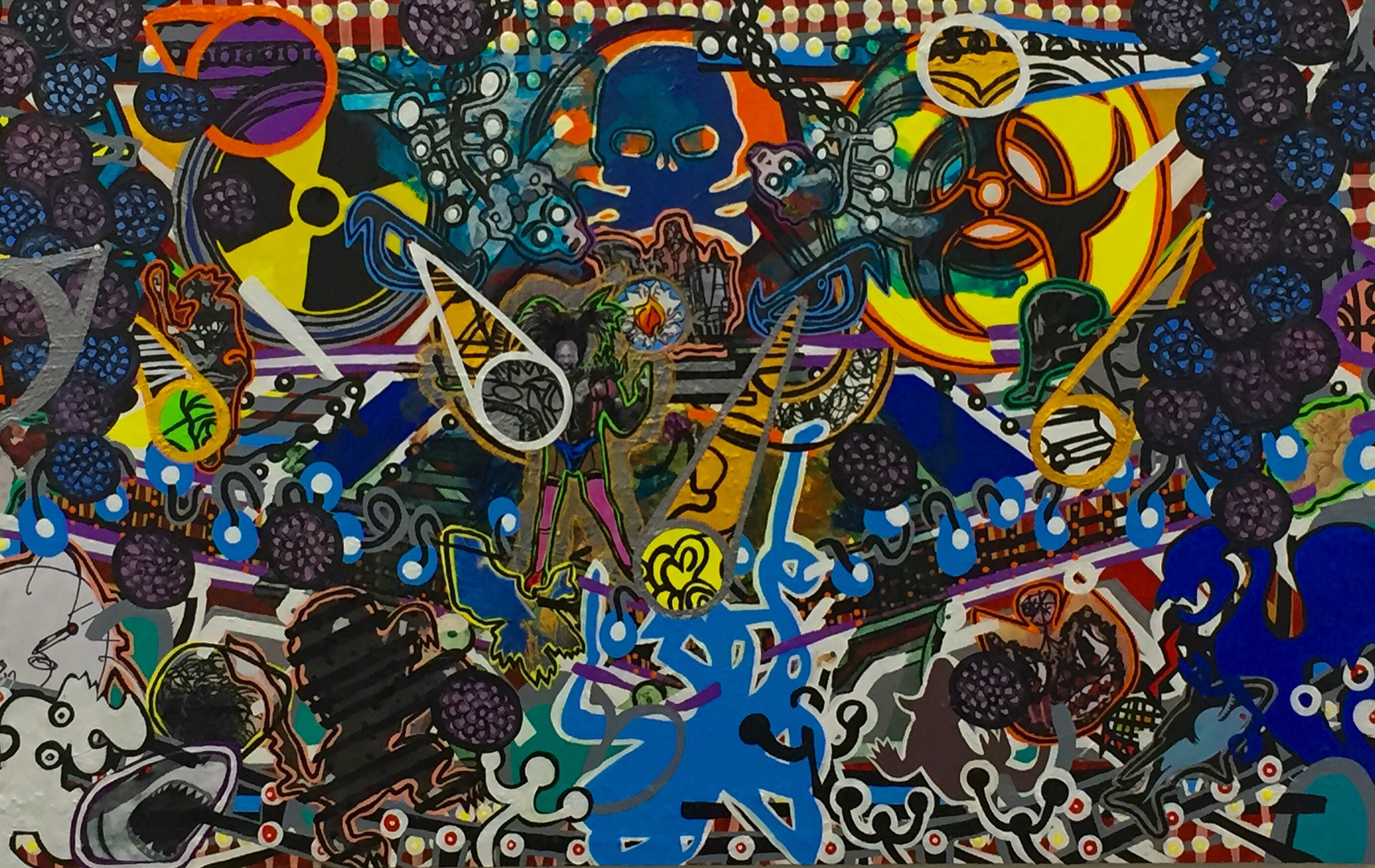 As for those visiting artists, I had two back to back meetings last Monday morning and they were both very illuminating though for different reasons. I met with Sarah McEneaney and Miguel Luciano and was nervous for both visits. I met with Sarah McEneaney first. I prepared by going down a list of questions in the hopes that I would get the most out of our time. I asked her about the space in my painting “The Hotness in Concert”. I was concerned about the tightness in the piece. She seemed to not mind the close quarters and liked the use of colors and repeated circle motifs throughout the work. I also asked her about other artist opportunities and she was kind enough to provide both suggestions of other artists to look at but also her contact info so I can use her as a recommender, which is like career advancement gold.