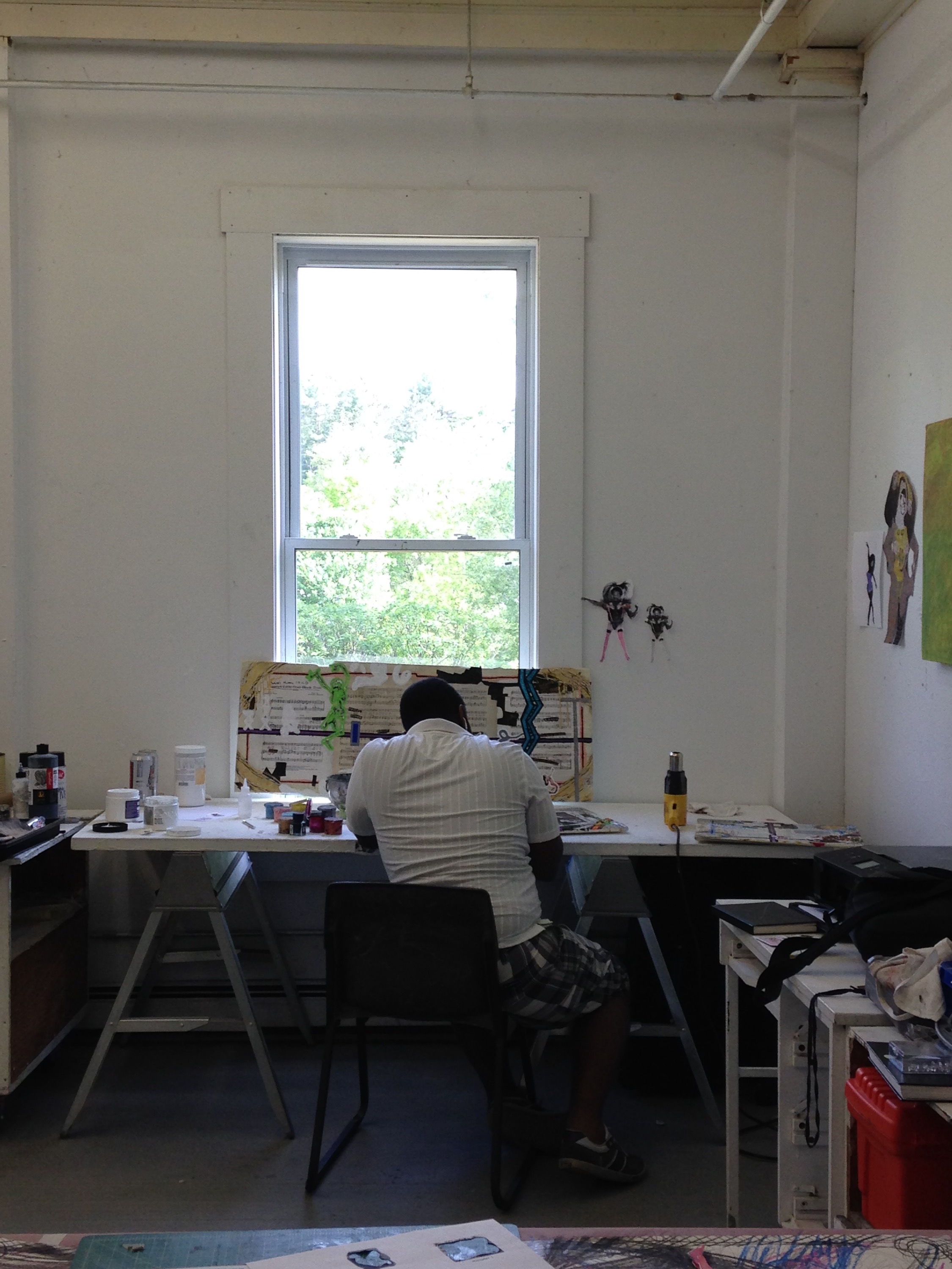 Last week was the end my residency at the Vermont Studio Center and it was a busy one with three projects completed and two studio visits from visiting artists. It’s sad to have wrapped things up. I feel ill prepared to face my life back in Pennsylvania again. I’m heading into a troubling season with my work situation and my housing looking uncertain. But before I face all that I wanted to take a moment to give my assessment of the Studio Center, my time with the two visiting artist visits I met and an update on the work that I started at VSC. Here I am feverishly working on a triptych:
