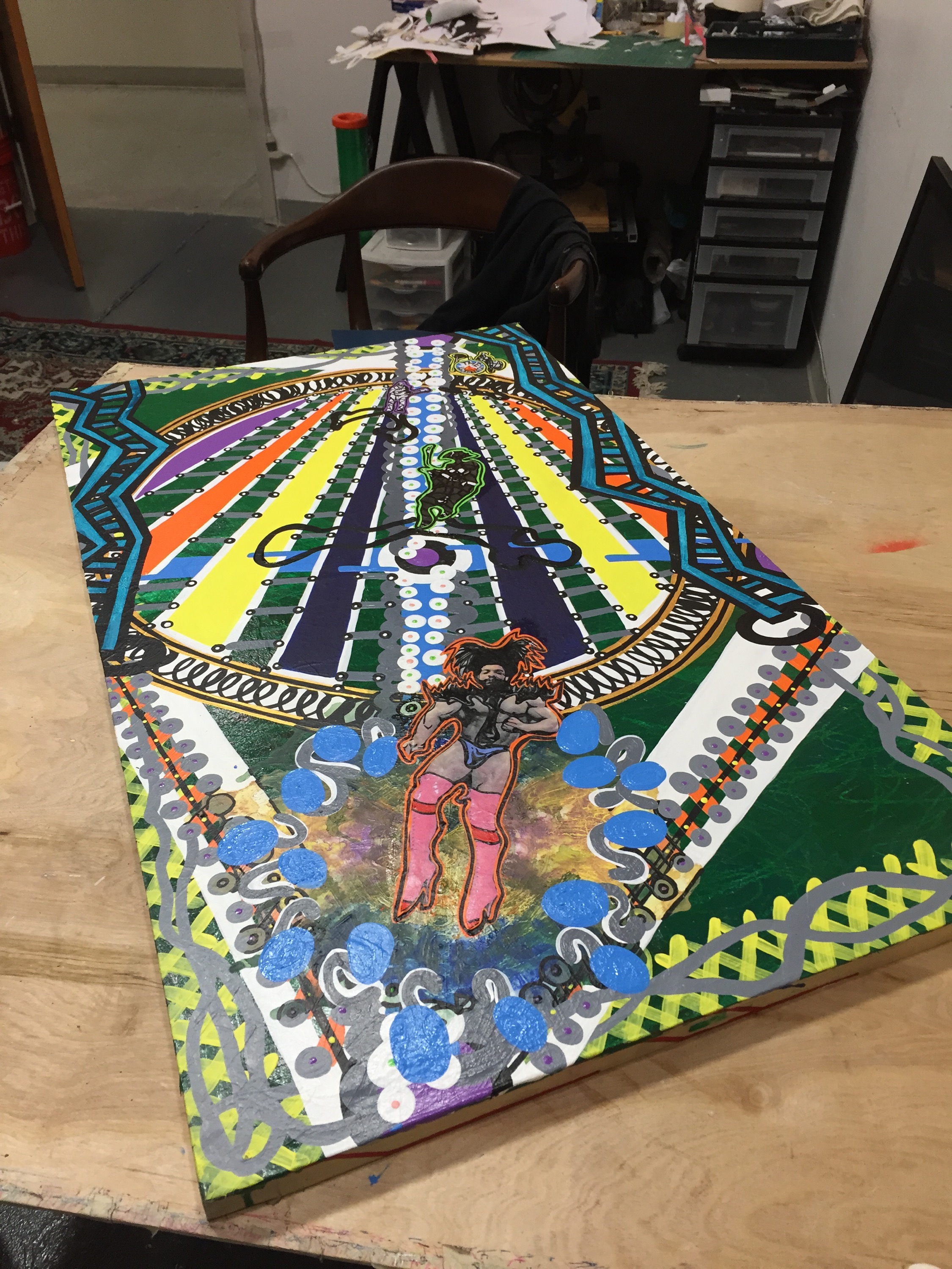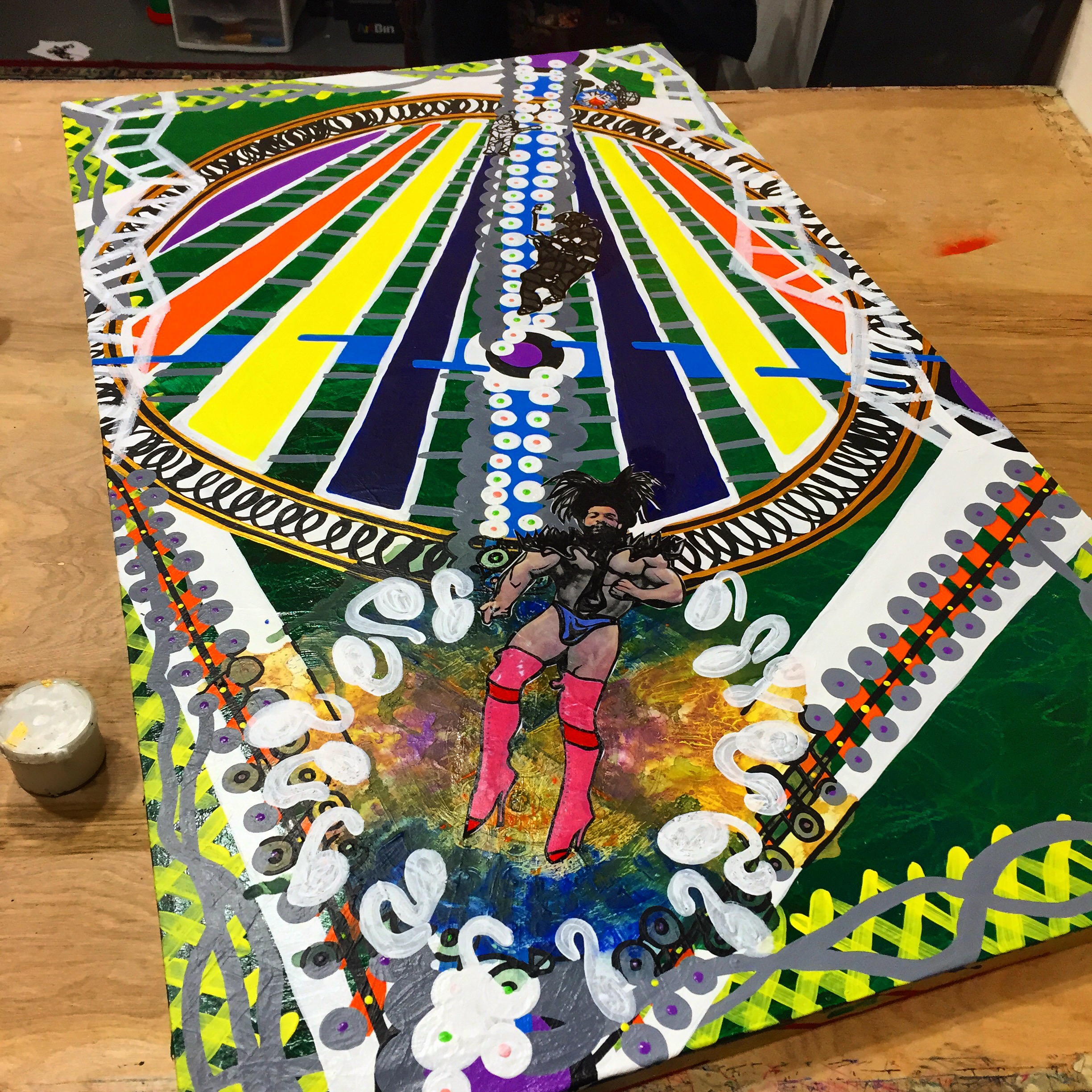 This painting was probably one of the most emotional pieces I’ve done in a while. I feel like I’ve been through the ringer several times in the two and a half months it took to make the piece. Without getting too much into what’s going on with me lets just say I now have a new appreciation for the sacrifices I’ve made since I moved to Pennsylvania. As for the painting it feels like a rainbow threw up and dried out on my panel. I’m not quite sure if the values are too intense. I generally enjoy high contrast super poppy colors in my works but this piece sits on the edge of lookability. It’s complicated and given what went into it that makes sense I think. Here are some instillation shots of the painting: