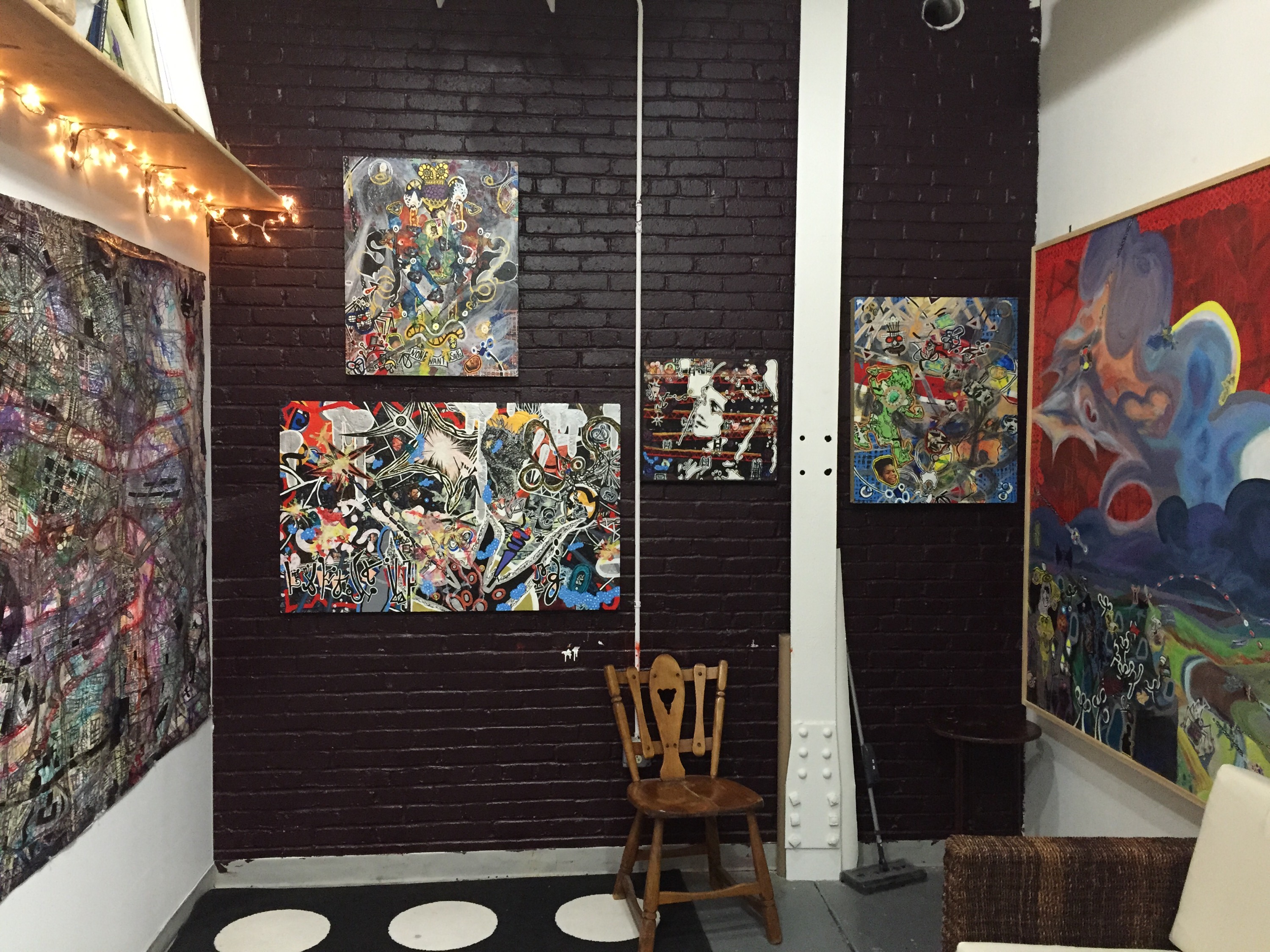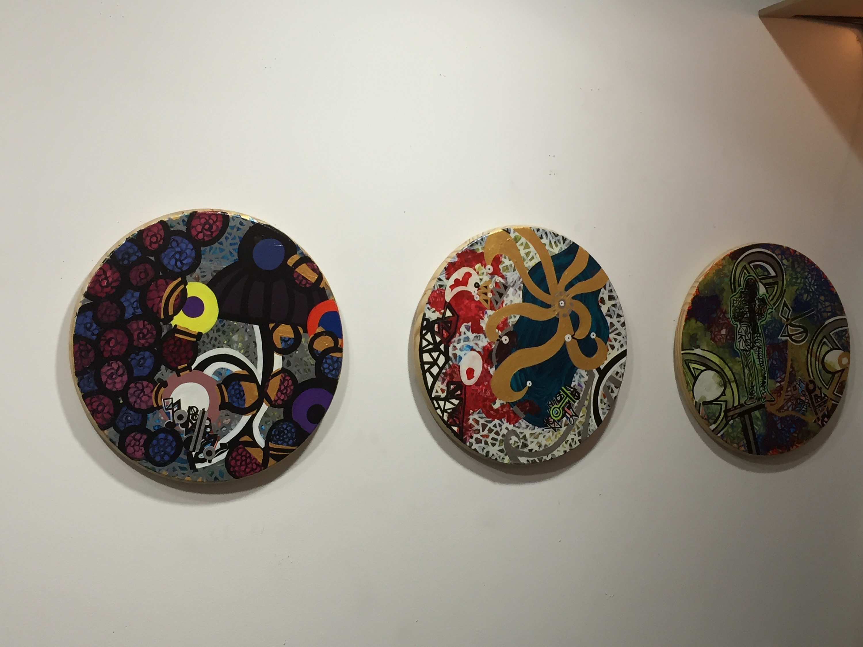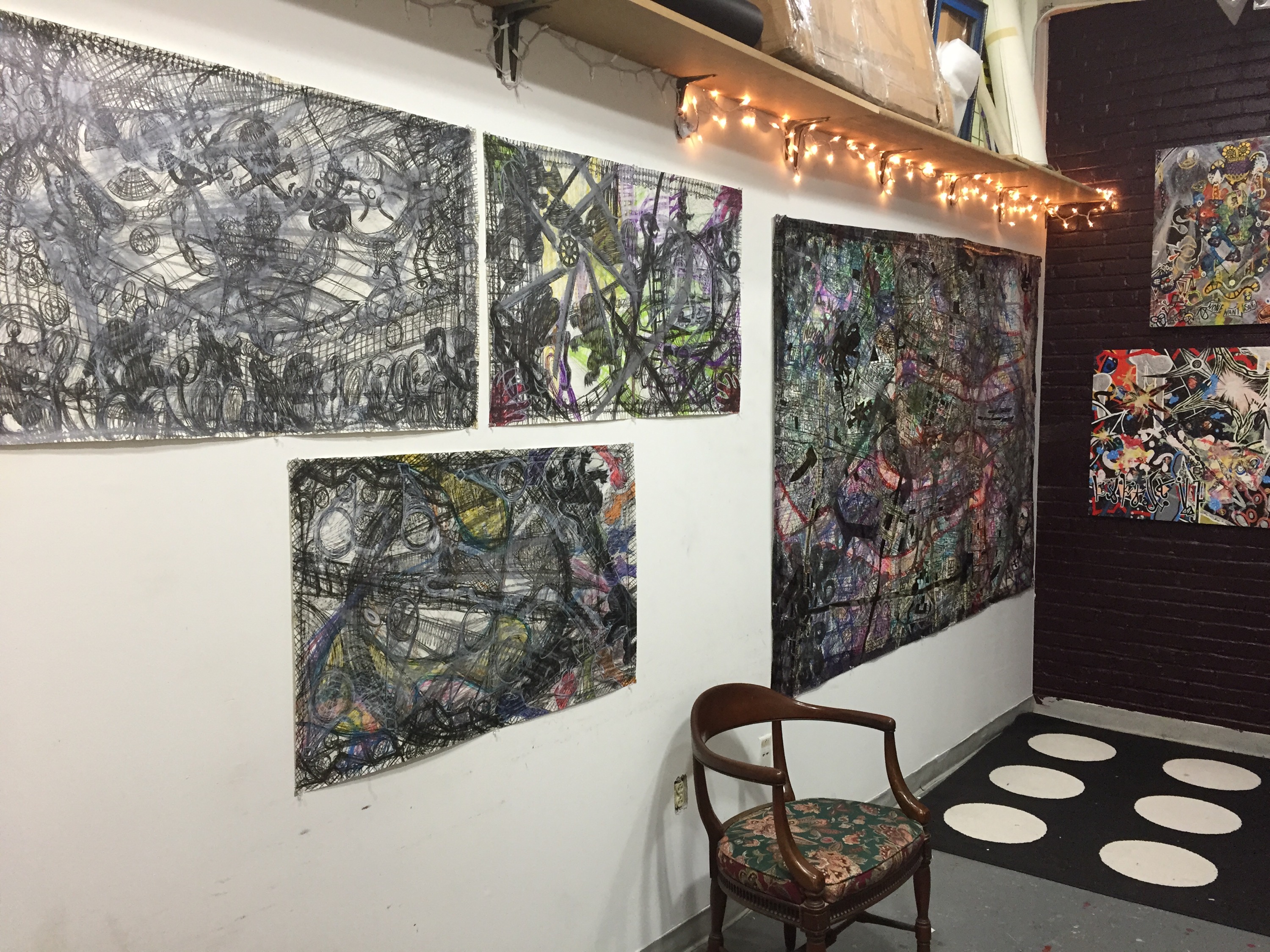 For this First Friday I decided to mostly put up older works from my “Who is Prester John” series and my “Original Eight in Apotheosis with the Isley Brothers” sets. I also displayed several drawings from my Hotness in Concert series along with Hotness No. 3. Here’s some images of the studio set up this month.