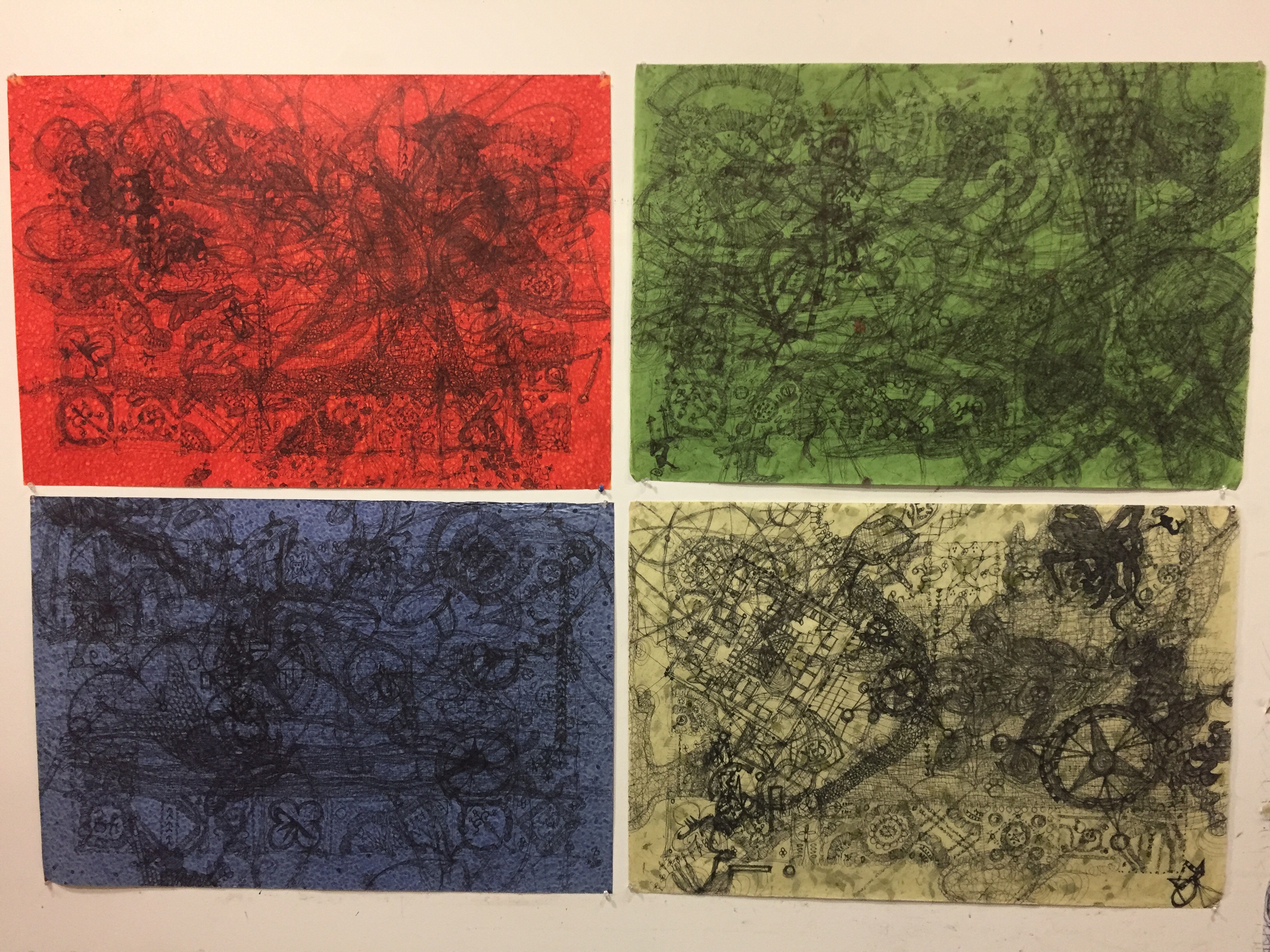 As people cycled in and out of my space Tyrone and his lovely daughter moved on and I continued my hosting duties. I noticed folks as they were coming in seemed to gravitate to the colorful drawings I had on display. I showed works from my 2011 series “The Lovers at the Temple” which for the past 5 years were packed away in a flat file. Here’s what they looked like in my space: