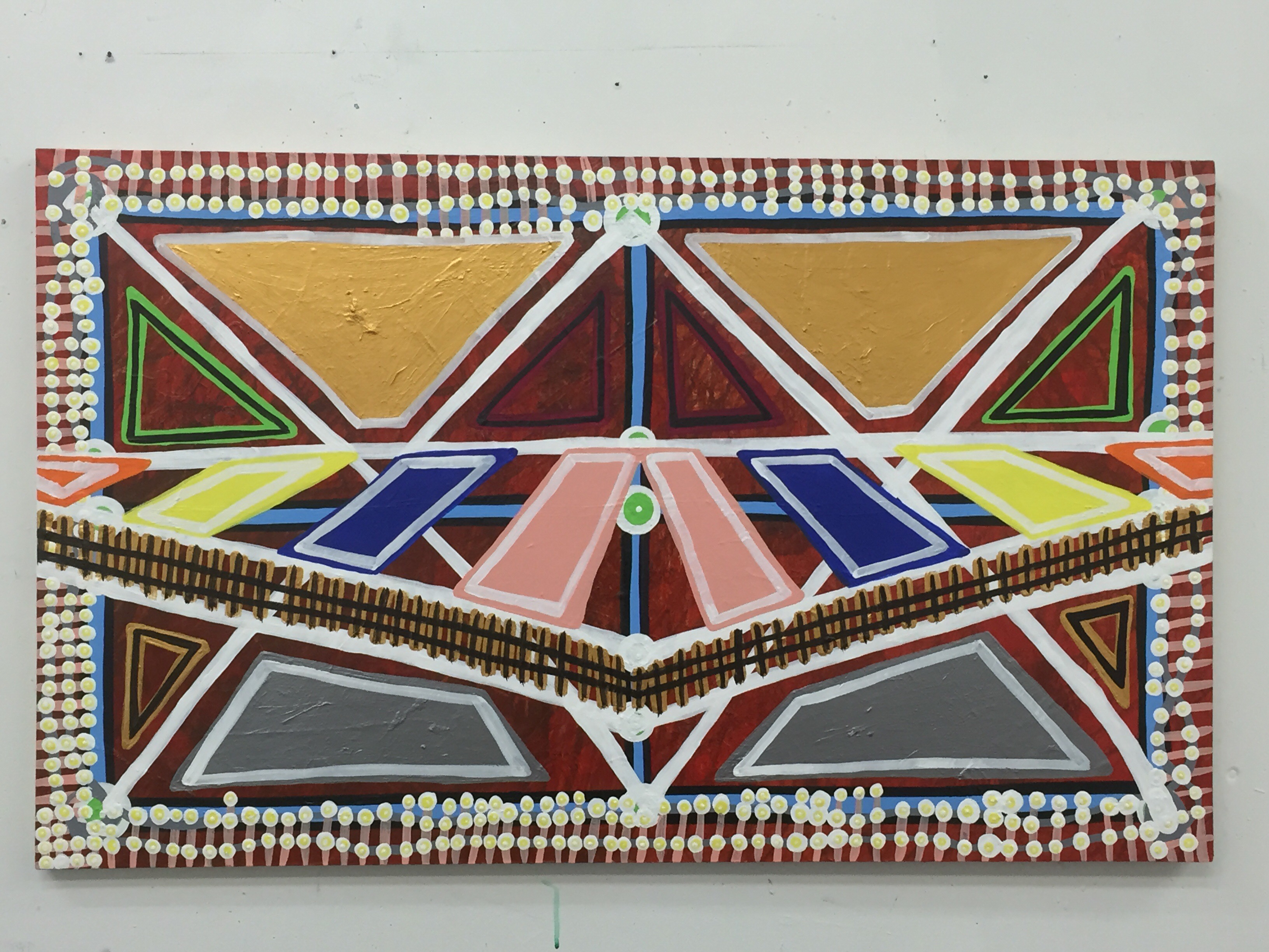 The truth I believe is that I create these under-paintings as a crutch, a type of security blanket to hide the fact that I really don’t know what I’m doing in most of my works. My style of abstraction really began as me fumbling around with shapes and patterns until something coalesced that I could build on. A good example of this is from my painting series The Vixen Virgin Mermaid of the Sargasso Sea. You can see a slide show of the process of painting this piece here. The first four steps in this process are where I’m just playing around, exploring. See here:
