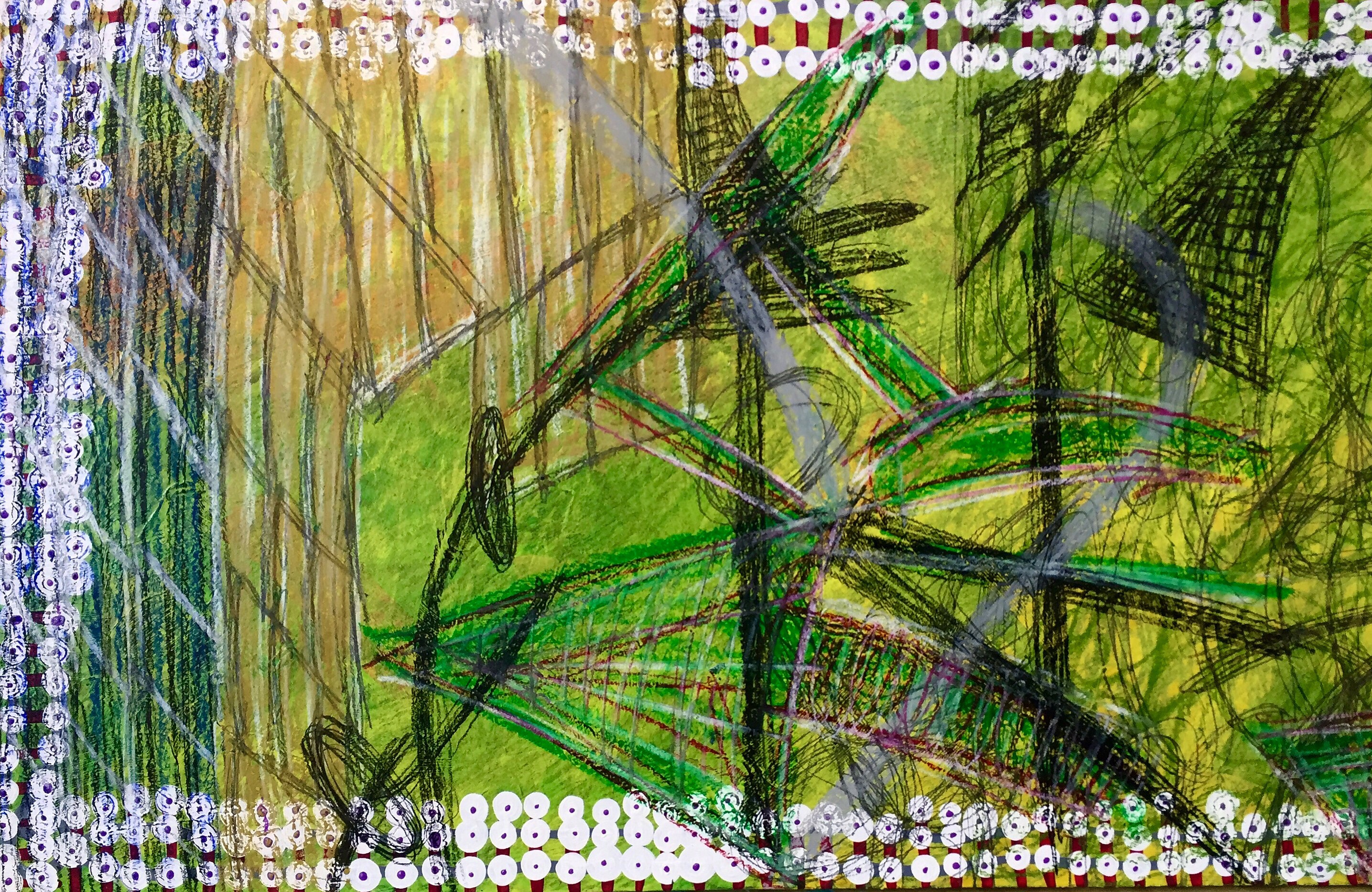 The rationalization that I give behind creating such rich under-paintings is that it provides a surface that successive layers of paint and collage must respond to. I do believe this is a valid rationalization but it also hides the fact that it is often coincidental and not my original intent. A good case in point can be found in another current painting series I’m working on, the Hotness in Concert. In both the first and third painting in that series the under-paintings became their own beasts that should have been paintings in their own right. Here’s where each work became something different than what was initially expected: