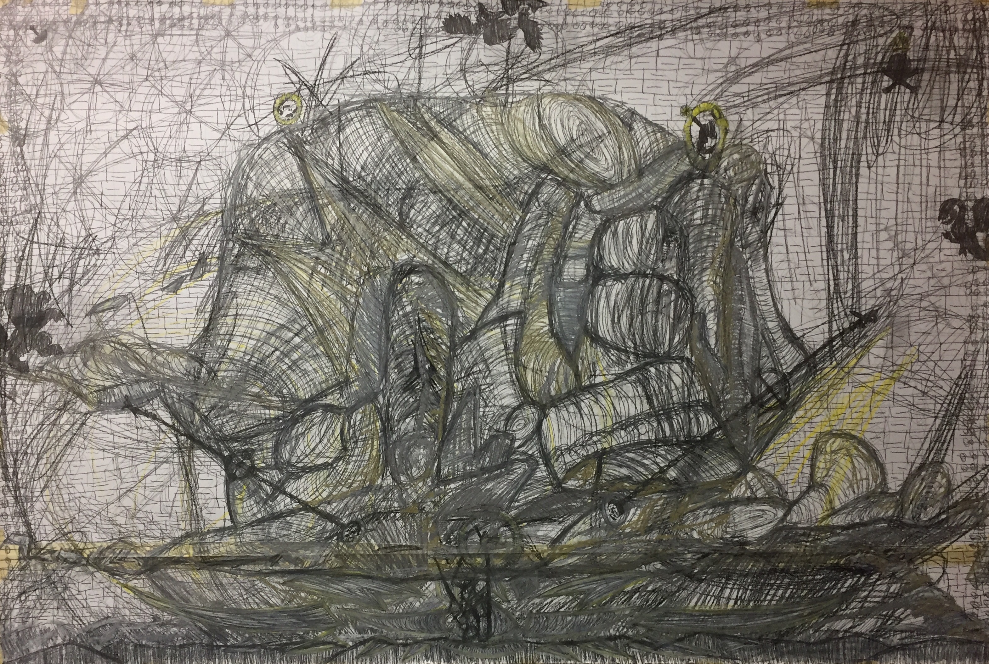 I finished the sixth painting of the Pilot Set a couple weeks ago and the drawing for the seventh Pilot painting two days ago. I’m finally settling into working on this next monster painting. The process of doing the drawing of this seventh work has been quite instructive. I realized while doing this drawing that I’m again quite a slave to pattern. Motifs and elements of other Pilot Set works appeared where they needed to appear to remain consistent with the rest of the series; and I found completing the drawing as seamless as taking a breath of air, I was so familiar with the rhythm.