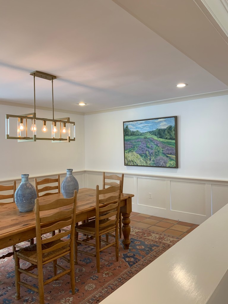 I been vacillating between abstract pieces, astronomical or botanical scenery and I’m heartened that my tiny fan base out there seem to appreciate what I’ve put out in the world. I’ve received sales and encouragement for just about all the work I’ve done lately and it’s given me the personal fuel, or go-juice I need to keep going. While at work recently for example a client of mine, the lovely Laurel Huber, sent an image of my work “Spring in Emmaus” hanging in her dining room and it was so nice to see again. I work an often grueling service job so little moments like that really lifted my spirits and make me feel like I am on the right path, and that painting risky large ambitious works of art can pay off. Here’s the image that Laurel sent me a few days ago.