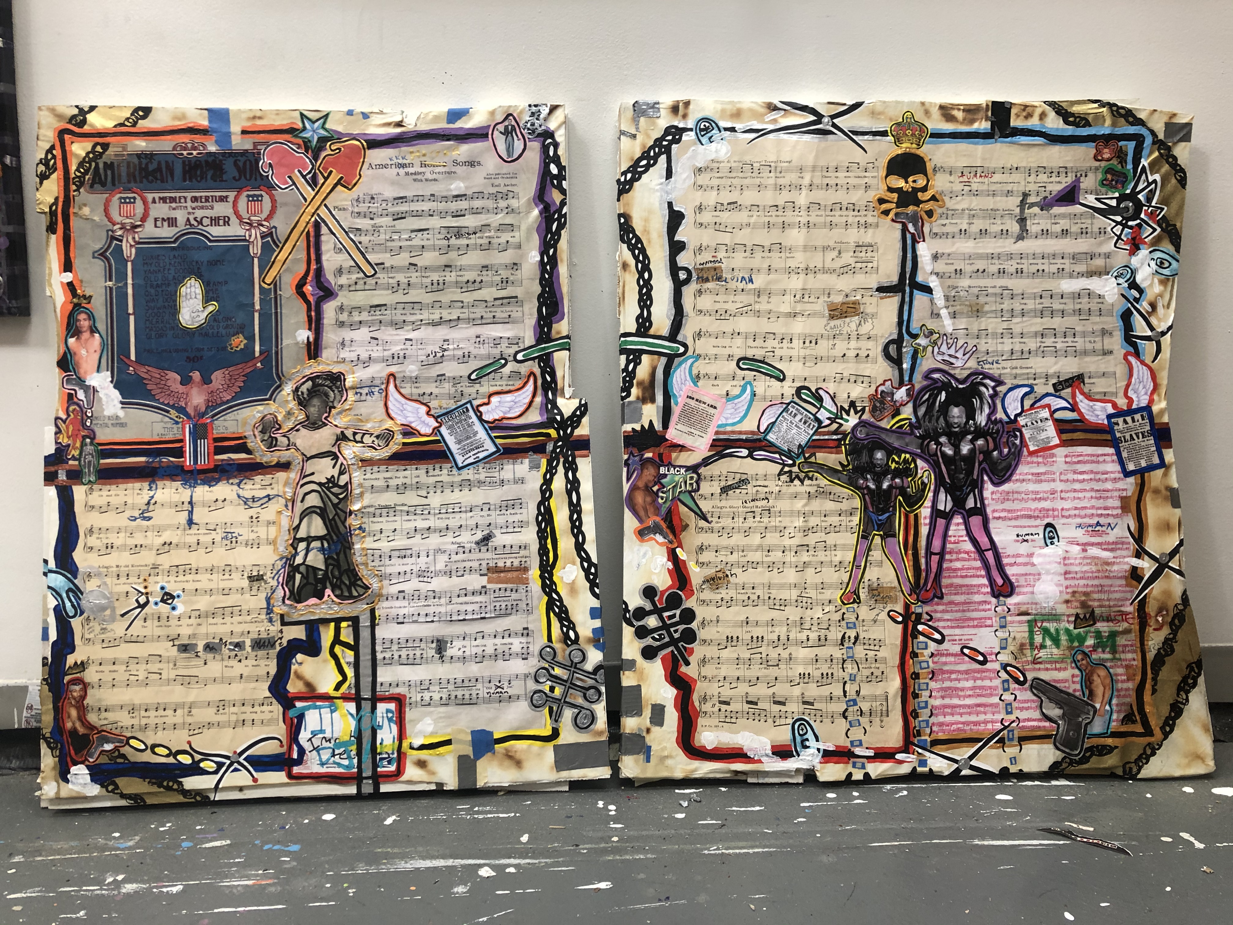 As I close in on finishing this piece I’ve thought a lot about my relationship to its subject matter and the people who have inspired its creation. Initially the piece was inspired by a young gay man (the titular Malik) living his life in the town I live in and doing the best he can to live and survive. I began to think about the world he lives in and the challenges he regularly faces. I relate so much to his journey. He reminded me of a character from a novel I read when I first moved to New York back in 2002. The novel is called B-Boy Blues by the singular writer James Earl Hardy and the character’s name is Raheim. The archetypal banjee or B-boy, Raihem became my symbol of how to survive in New York, mostly by doing the opposite of what he did because he was written to be a very flawed man. I think I’m not alone in finding something intoxicating in bad boys. It’s my hope that in this piece my porno-gundick-floating-kings, along with my bodybuilding drag queens, and of course the original drag-queen William Dorsey Swann, expresses black male sexuality and freedom in defiance of oppression. Here’s where Malik’s B-Boy Blues stands as of last week.
