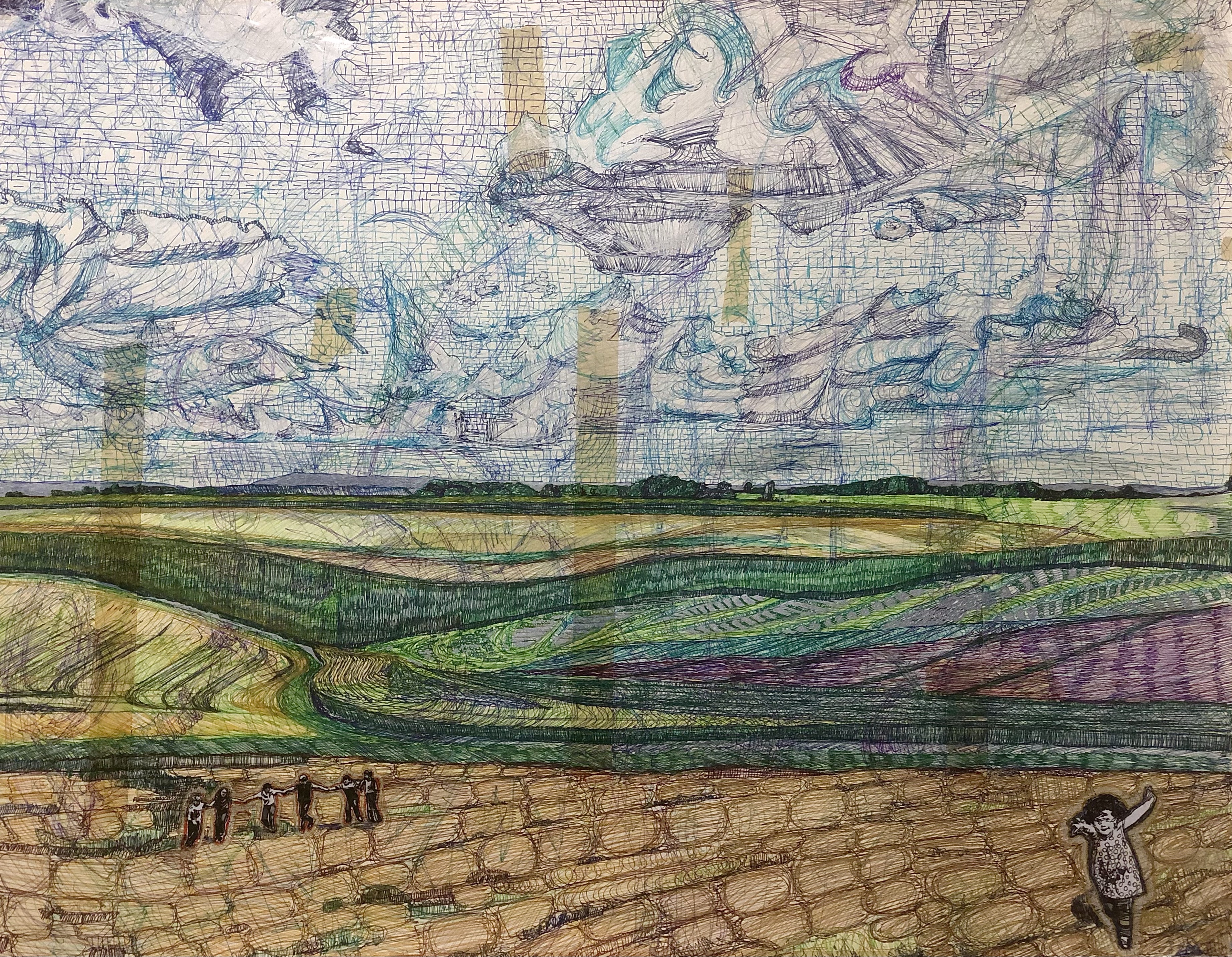 When I was a kid growing up in Dallas I remember class trips to the farm and to the butcher. It was a sometimes very smelly but eye opening experience, I think it’s important know where your food comes from and sending kids to theses places quickly changes any young ideas one might have that food magically appears at the grocery store. I was reminded of these trips when I visited Prout Family Farm this last summer. The farm, owned by the friend of my housemate Michelle, is a lovely world unto itself. The place gave me a nice reminder of how food is produced and of the beauty of rural settings. The spoke about that weekend here once before stating then that I thought there might be a painting lurking there for me. I thought I might do a drawing series based on shots of the vegetable gardens I saw there but instead it was the corn fields that mesmerized me when it came time to choose and combine images for these commission scenes. Here’s what I came up with from those snapshots. These are sharpie pen drawings of several scenes: