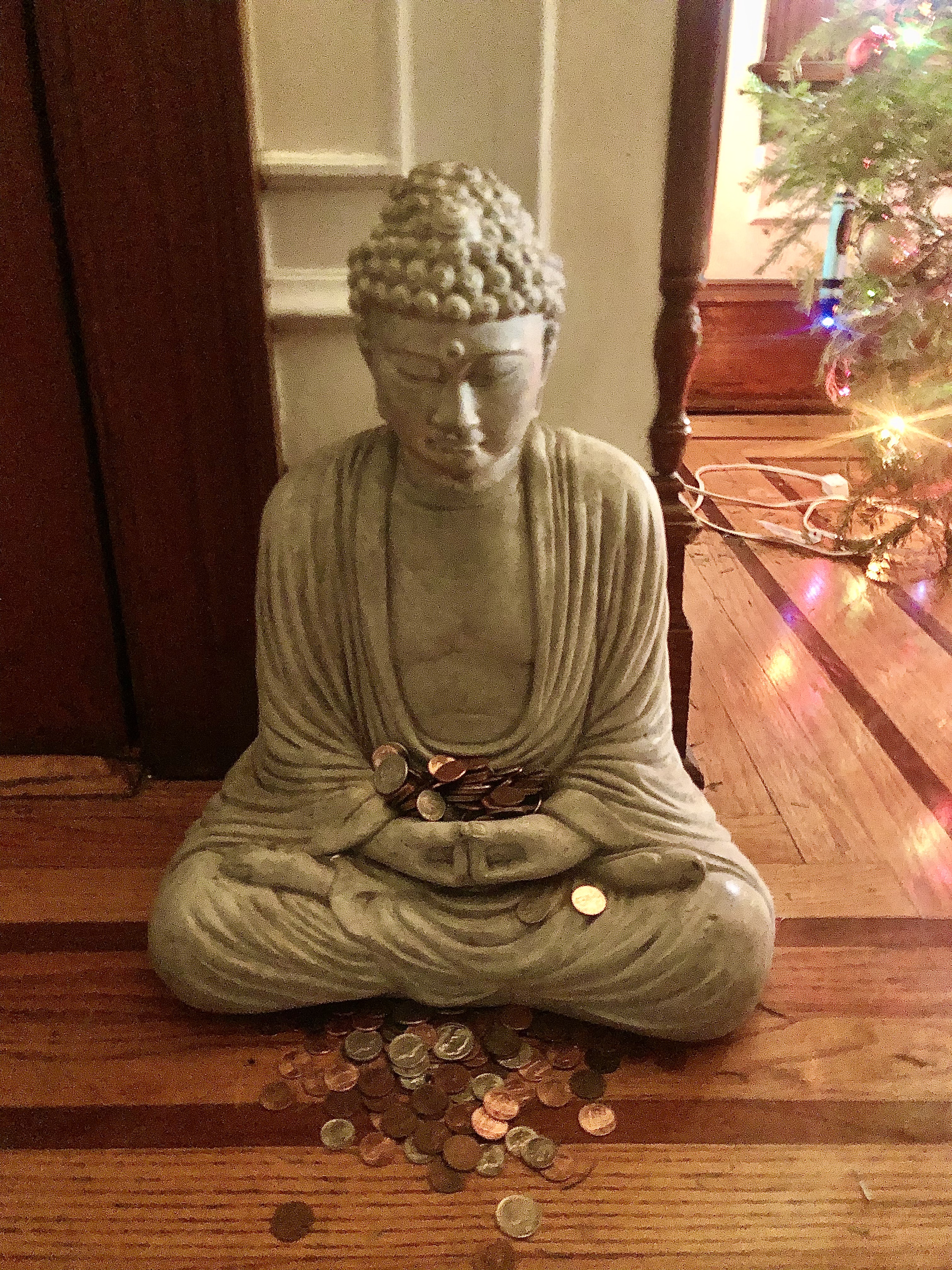 I have this change Buddha at the entrance to the house door that I tell everyone to feed. I tell people “Feed the Buddha because he will multiple the change into untold dollar riches”. For me this is a gimmick, a change in mindset that came about when I needed to focus my wish-fulfillment energies around an object a few years back. Do I believe I have a magical genie in my home, of course no. But the Buddha does change my focus albeit subtly I believe. In this year of change I think that little bit of mindset change, that a talisman if you will, is just the sort of thing we need to adapt and maybe thrive in our new pandemic and post pandemic normal.