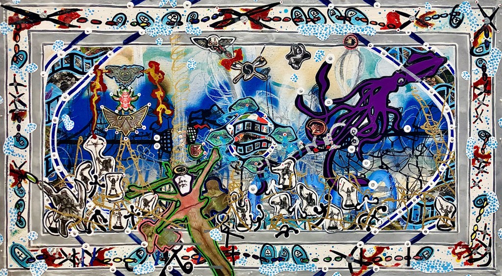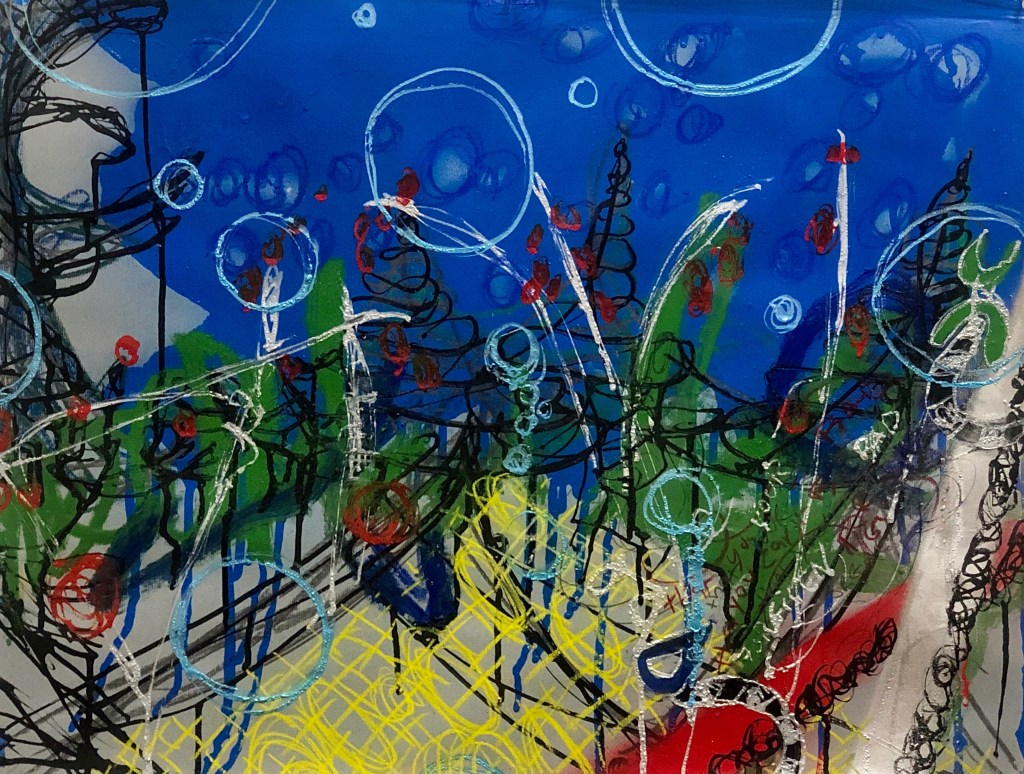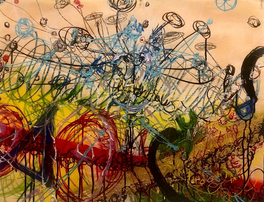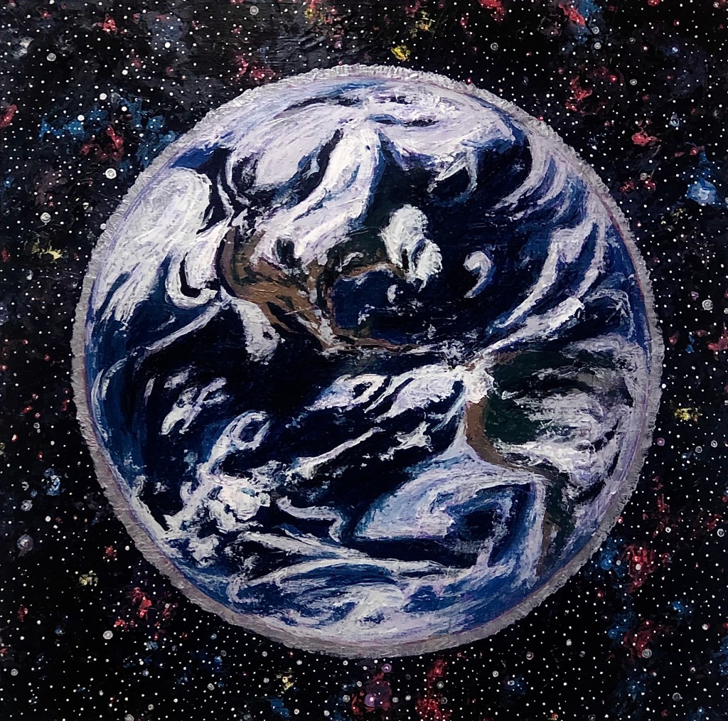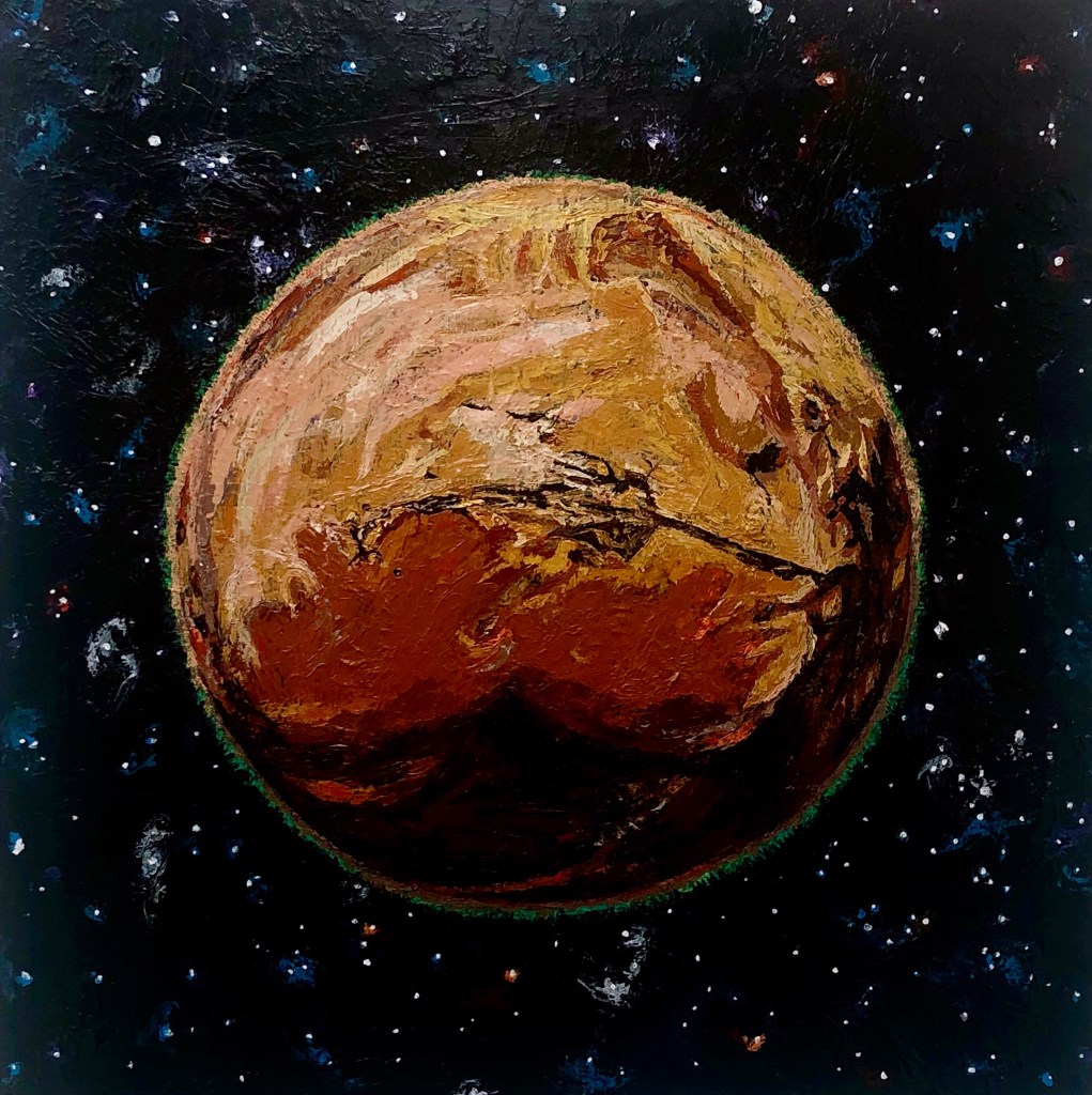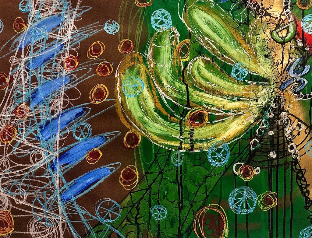 It’s hard to believe that when 2020 began I was still painting planets paintings and the Higg(ins) Boson series and imagining how I would put those works out there in the world. I had just finished a very successful show at the Bethlehem House Gallery and was looking forward to a year of commissions, gallery shows, a new President, and the Olympics. Things seemed so innocent then. Actually someone reminded me the other day that Trump was actually impeached this last year and I swore that it happened in 2019 or the year before. As I reflect on this last year and all the hardships that unfolded I’m am continually thankful that I had my art, and that the Banana Factory Art Center stayed open to the artists. I’m so happy and appreciative that the staff and administrators worked so diligently to keep the space clean and open because I can not imagine how I would have gotten through 2020 without my studio.