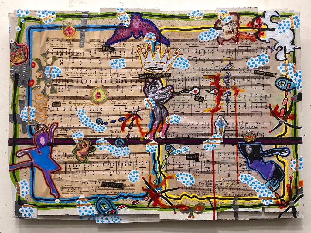 As the pandemic swung into full gear I decided that my studio would become my one refuge out doors, especially in March and April when lockdowns were everywhere. I took the time I received from work and did several series nearly at once. I did the 2020 rendition of Puppet Pal Friends, this one called “Puppet Pal Friends Hold Fast to Hard Dreams”. And I completed the first chapter 4 paintings of my Gnostic Confessions series.