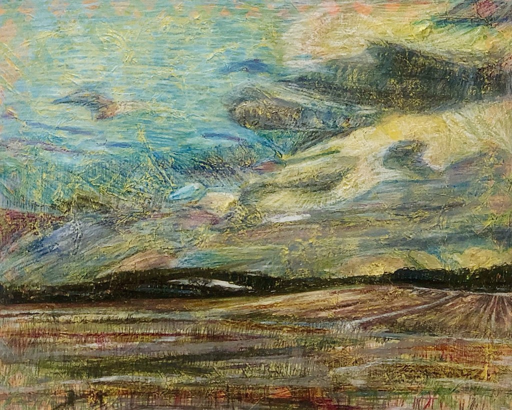 An unfortunate consequence of my process is that it’s difficult to devote myself to more than one project at a time. The other night when I went into the studio I had to turn away from the this cedar shingles “cracker” series because it was just too insistent. My buddy Al Johnson turns works over completely in his studio when working on a piece he has to concentrate on to keep the voices down as it were. I have to say it’s an enviable position to be in to have too many pieces speaking to you, and you as an artist feeling torn on what to work on. In the late fall I remember feeling just to opposite, like I had run out of some steam in my process. I think what’s attracts me now about the “cracker” pieces I’m doing now verse the landscapes – besides how timely they feel – is that they are so intricately constructed. I have this particular way that certain elements in my abstract hermetic universe are constructed. I rarely cut corners with this process even if no one would know I did. More of my secret process I suppose. It’s an addictive method of painting verse the landscape pieces, which have their own challenges. The landscapes in turn feel more like finding artistry in a traditional pallet knife approach to rendering, fun but more technical then anything.
