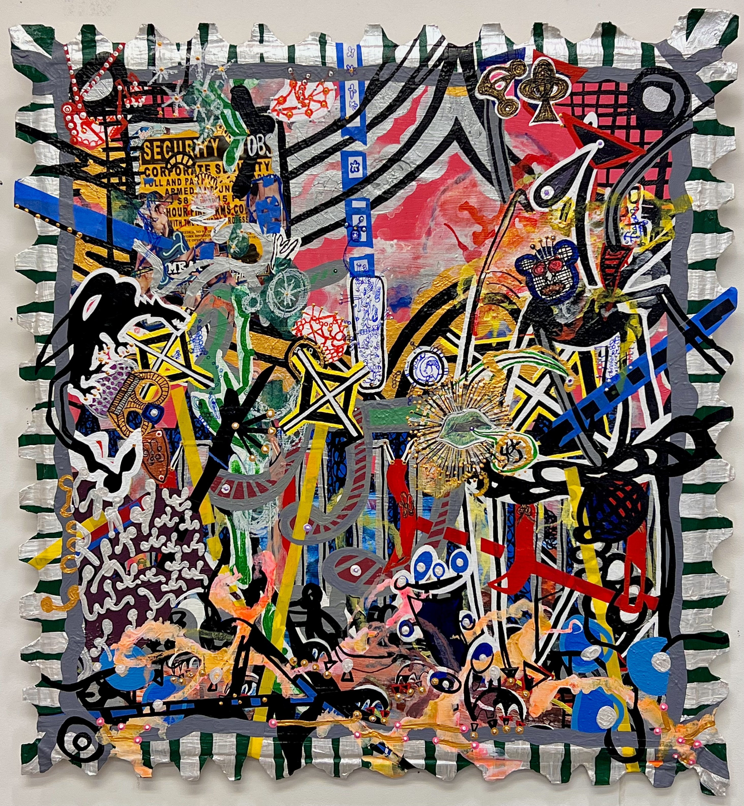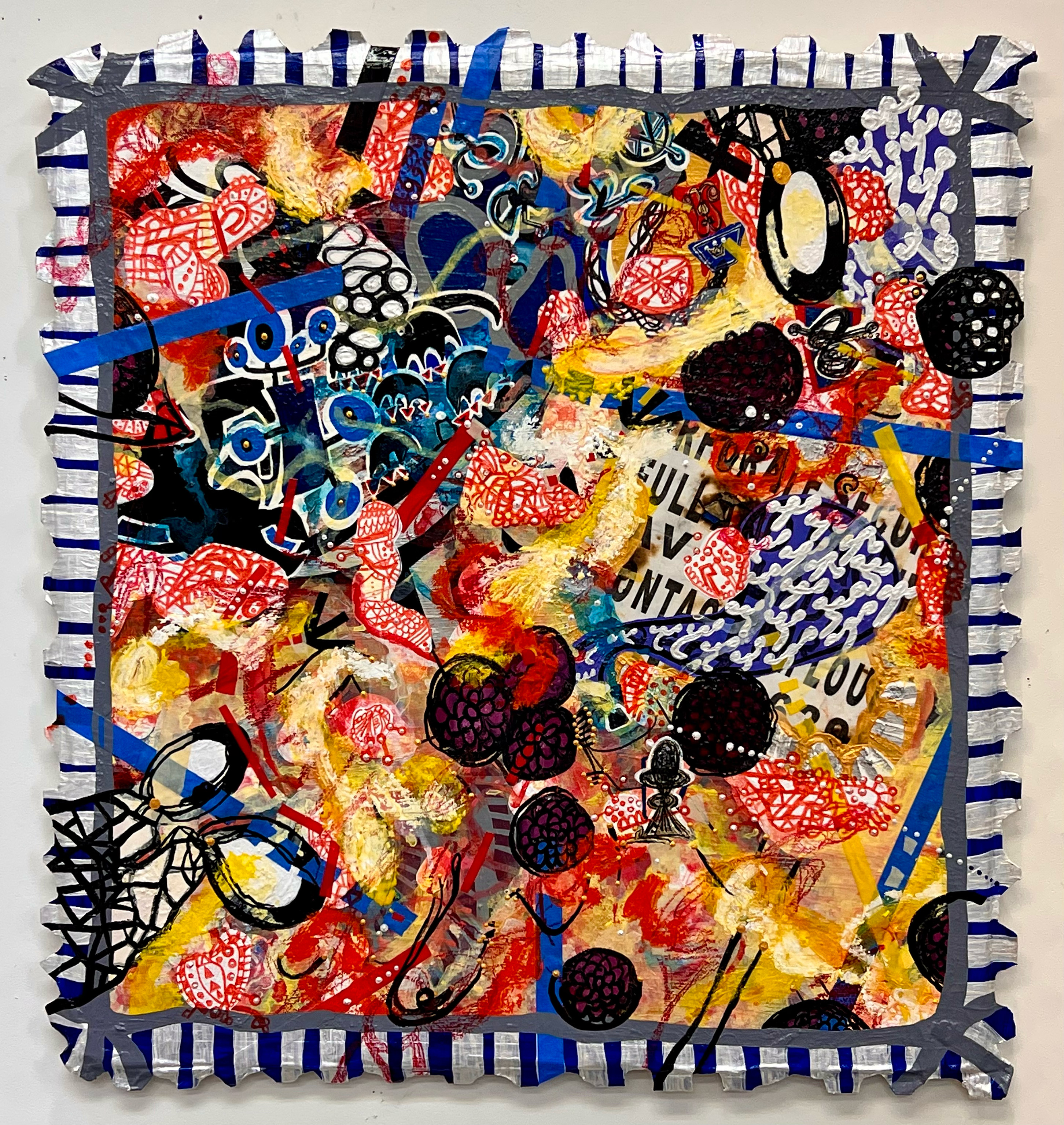 “Bensalem Post” is a set of two pieces that are meant as another re-tooling of an earlier series from the early 2000’s, much like my recent “Adjusted for Inflation” series. I made these works in reverse order. The second piece in the series came to me first the beginning of May, and I finished the first work mid-month. The original series, called “The Bensalem Set”, was my nerdy attempt to explore one of my favorite fictional works, Francis Bacon’s The New Atlantis. In this story, Bacon has British sailors stumbling on this South Pacific Island that just so happens to house a lost tribe of Israel, the Bensalemites. These Bensalemites, show the sailors the amazing wonders of the island, as a way of demonstrating their heaven-on-earth perfection. This depiction of utopia is one of the first written in English and I used it as a source of inspiration to create a visual story detailing the wonders that might be found in Bensalem. The first two works in the Bensalem Set series sold some years ago, so in freshening up this series I wanted to focus on the prostrating ephemera and fiery energies I imagined on this Island. These adjusted works are displayed as postage stamps from Bensalem, thus the name. I wove bisecting lines throughout both pieces in keeping with the way that I create works these days, tape being such a critical element in my style today.