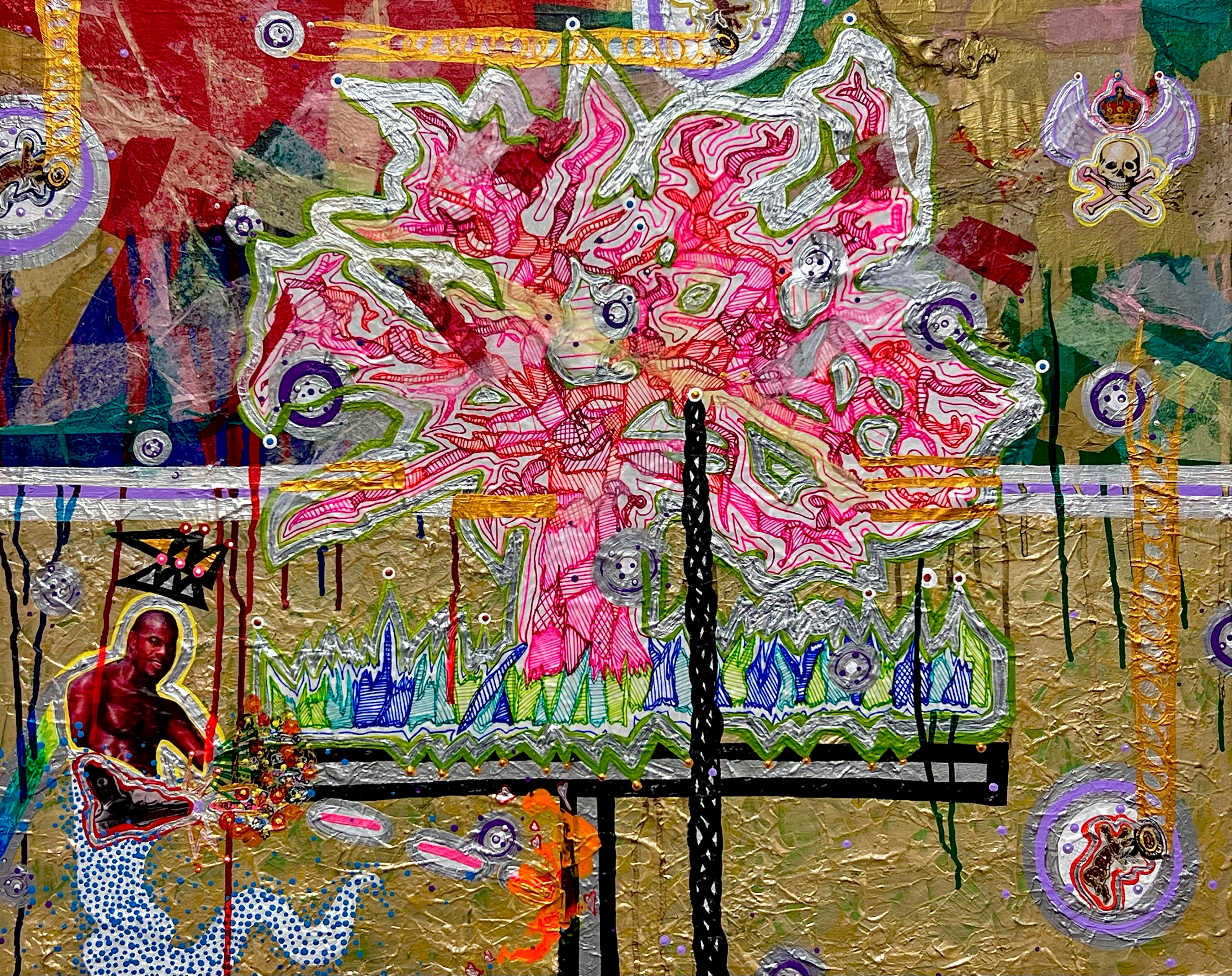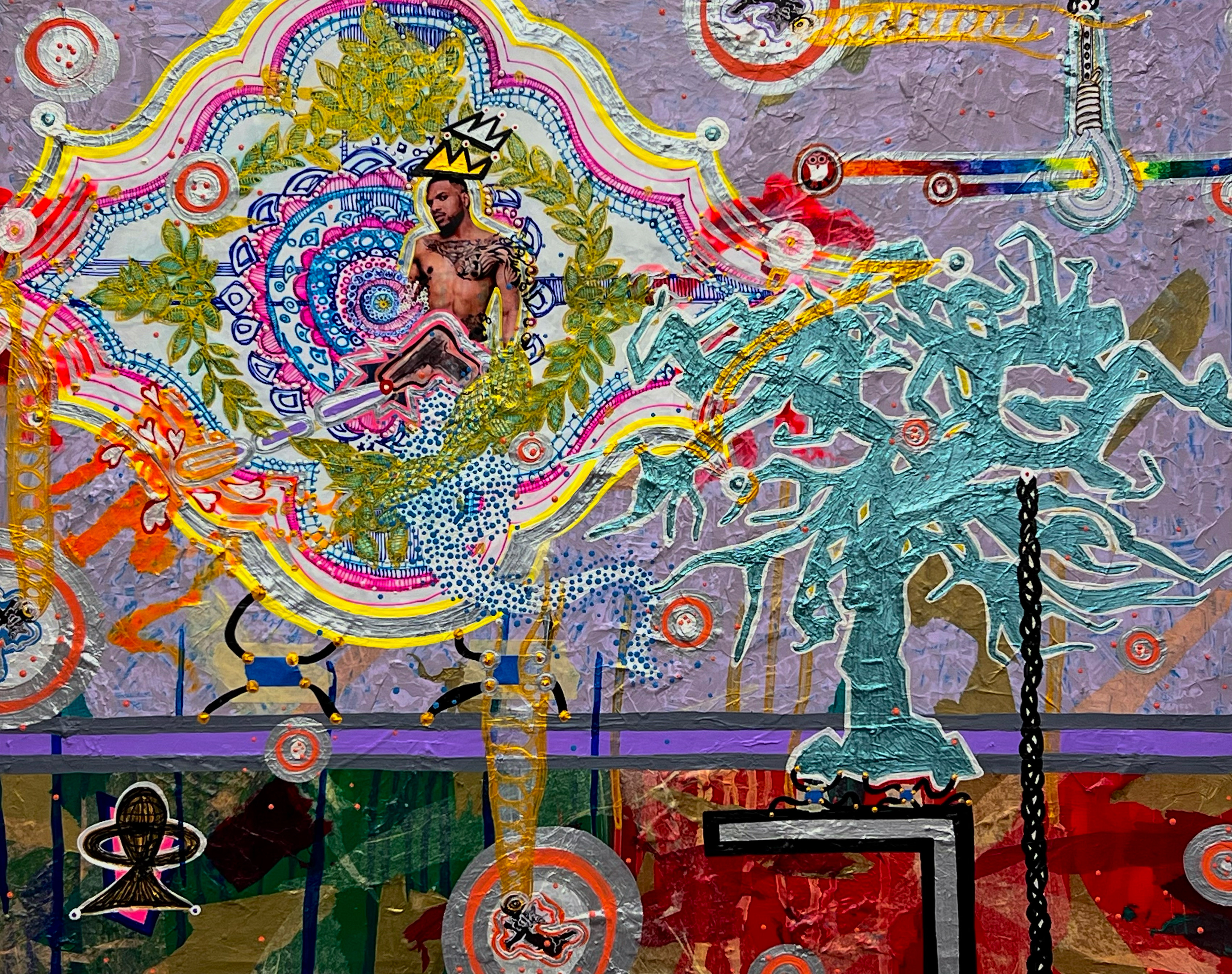 “Iwin Igi” translate from the Yoruba to something like ghost or spirit tree. The series came to me about a month ago back when I was thinking what happens to the black spirits or souls left behind after a lynching. I thought it might be fun to imagine these spirits getting transformed by the loathsome act of being lynched into benevolent spirits or genies that grant wishes to the wise who do good in the world. I’ve made two works in this set and so far. They both feel like a teen gay boy channeling Lil’ Nas X, which I love as I never had a real teenage gay adolescence. I’m so excited that while in Detroit I discovered the work of Leroy Foster thanks to the curator of the Mighty Real Queer Detroit show, Patrick Burton. Patrick owns this beautiful photo of Foster in drag as Martini Marti which I plan to create a stencil drawing of for my next Iwin Igi work. I’m so excited to make that work now. I’m sure it will be the penultimate work of the 4-part set