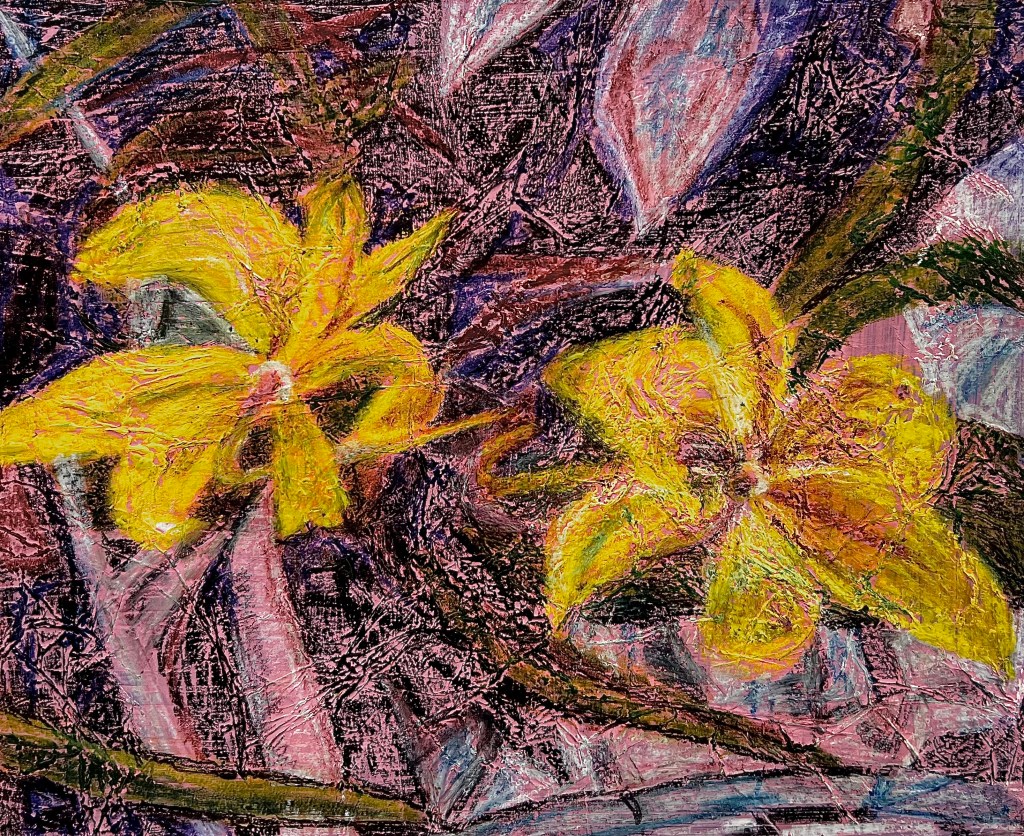 I’ve been working on 5 distinct bodies of work these past few weeks. They include a two-piece painting set I call “Bensalem Post”, a 4-part series of pieces I’m calling “Iwin Igi”; and three landscape or botanical works, “Flowers by Chuck”, “Tyrone Goes to the Capital” and “Big Sky Valley”. All this work needs to be more-or-less done by the end of June. I’m insane to attempt all this, but the personal sacrifice will be worth it in the end.