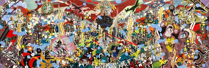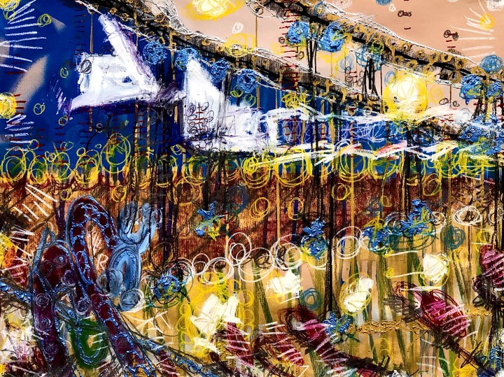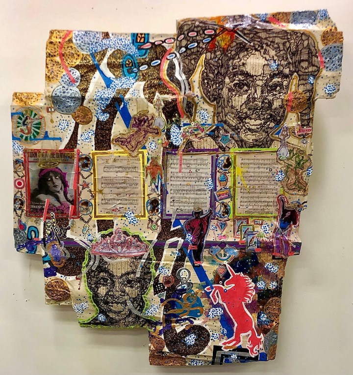“The imagination is a rich and fertile zone inside all of us and these works full of collage, popping colors and playful gestures, are my opportunity to activate this special place within our souls. Along the way these works might stir thoughts on the weighty issues of the day. Race, class, and sexuality are often stops on this journey. However, the mood is often keep joyance with irreverent ephemera zipping in and out each piece reminding viewers I hope that with a sense of humor and positive disposition all things are possible.”